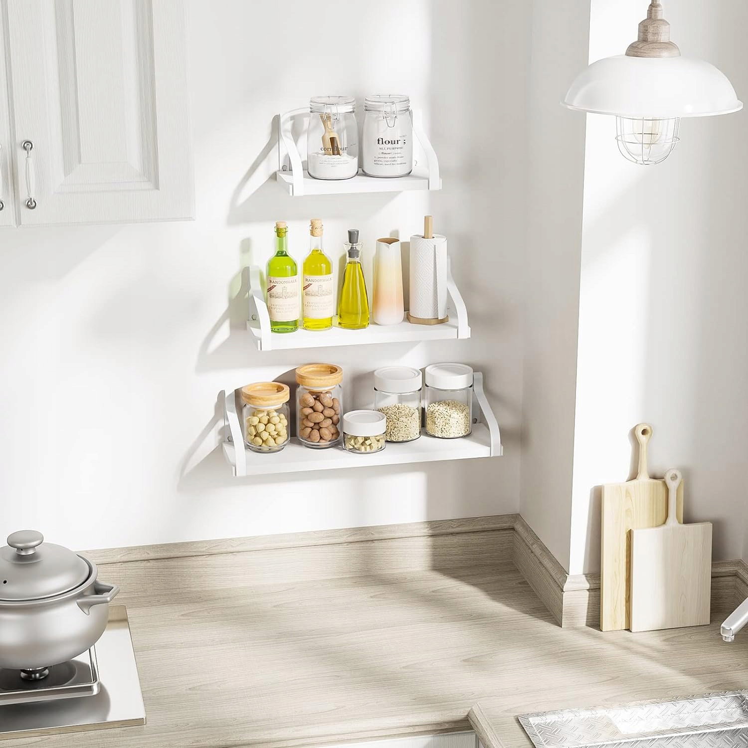 Rustykalne półki: Ten drewniany regał jest wyposażony w 3 drewniane deski i 6 metalowych uchwytów, wykończony piękną wypaloną teksturą, wykwintna dekoracja salonu, sypialni, biura, kuchni, spiżarni