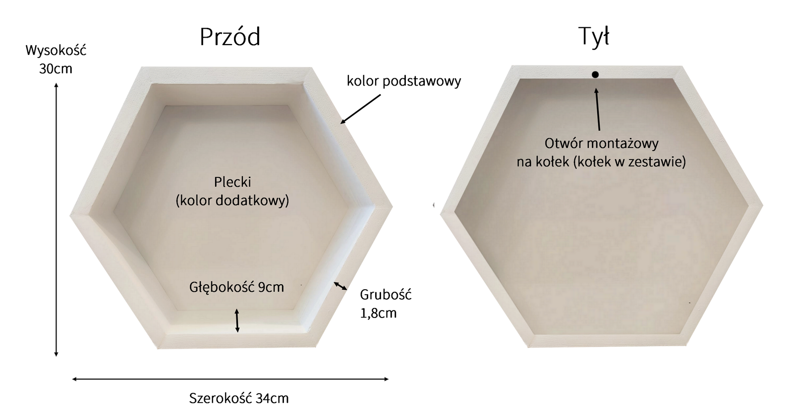 Półka heksagon z pleckami została starannie zaprojektowana, aby zapewnić zarówno funkcjonalność, jak i estetykę. Wyposażona w plecki, umożliwia wyeksponowanie Twoich ulubionych przedmiotów, pamiątek, roślin doniczkowych i dekoracji. Dzięki temu możesz stworzyć unikalne kompozycje i wykorzystać przestrzeń w kreatywny sposób.