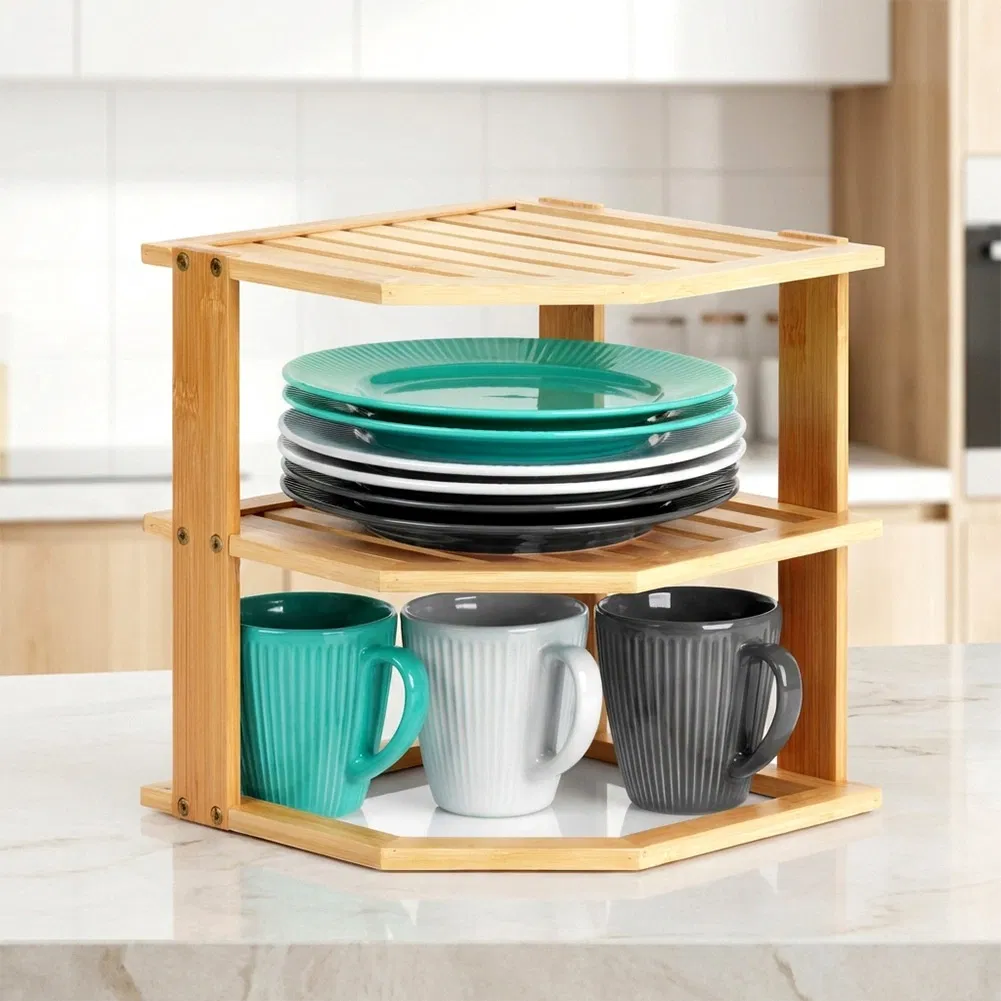Narożna półka kuchenna pozwala efektywnie wykorzystać przestrzeń i utrzymać porządek na blacie lub w szafce. Trzy poziomy zapewniają dodatkowe miejsce do przechowywania, a solidne wykonanie z drewna bambusowego gwarantuje trwałość i stabilność użytkowania. Praktyczny i estetyczny element wyposażenia, który sprawdzi się w różnych pomieszczeniach.