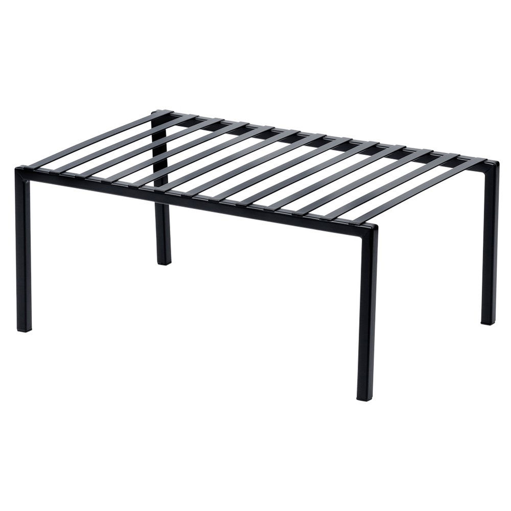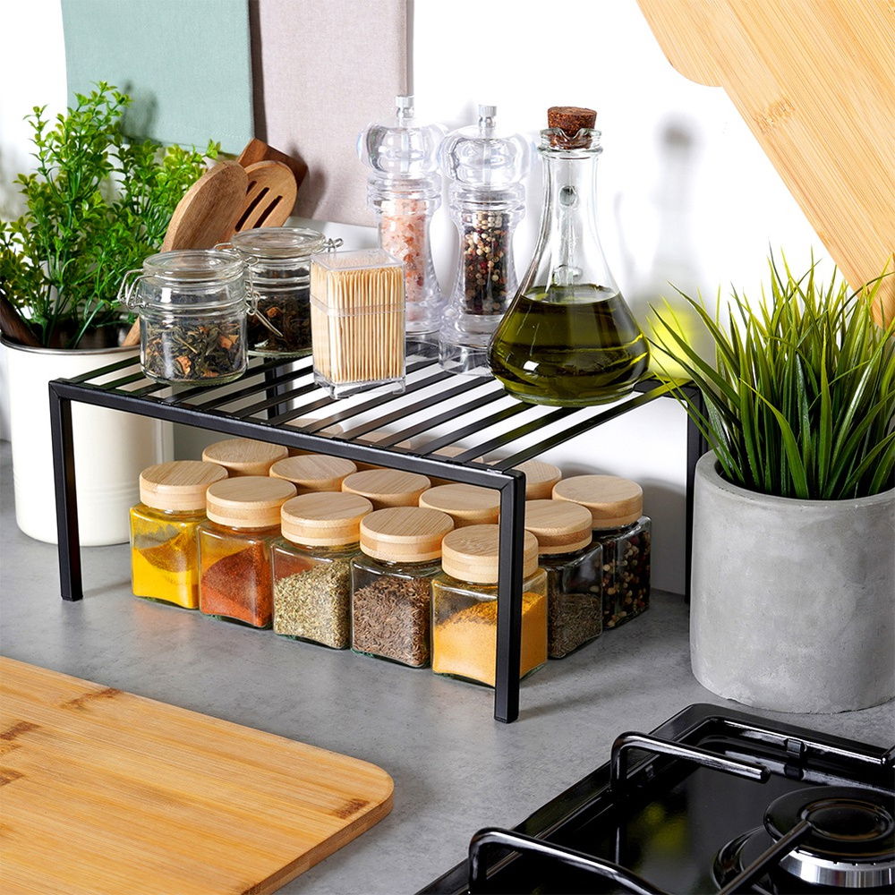 Praktyczna półka idealna do uporządkowania przestrzeni w kuchni. Półka dzieli blat lub szafkę na dwie części, dzięki czemu zyskamy dodatkową przestrzeń do przechowywania akcesoriów kuchennych. Półka jest niezwykle uniwersalna. Idealne rozwiązanie dla tych, którzy chcą efektywnie wykorzystać dostępną przestrzeń w szafkach lub na blacie.