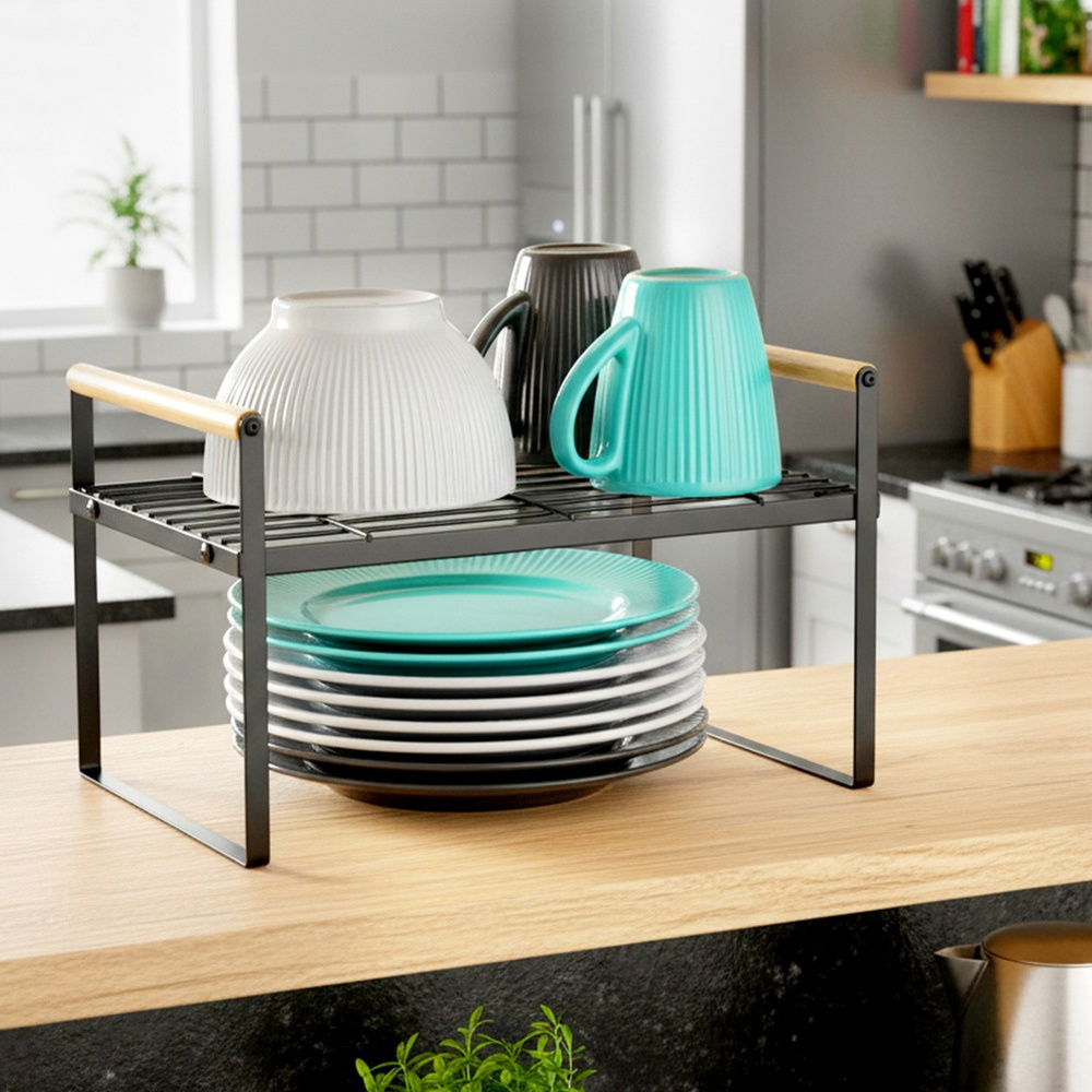 Solidnie wykonana i stabilna - Wykonana z najwyższej jakości metalu w czarnym kolorze, a uchwyty wykonane z drewna bambusowego. Półka jest wytrzymała i stabilna. To praktyczne rozwiązanie pozwala dopasować ją do różnych przestrzeni - w szafkach, na blacie czy w spiżarni.