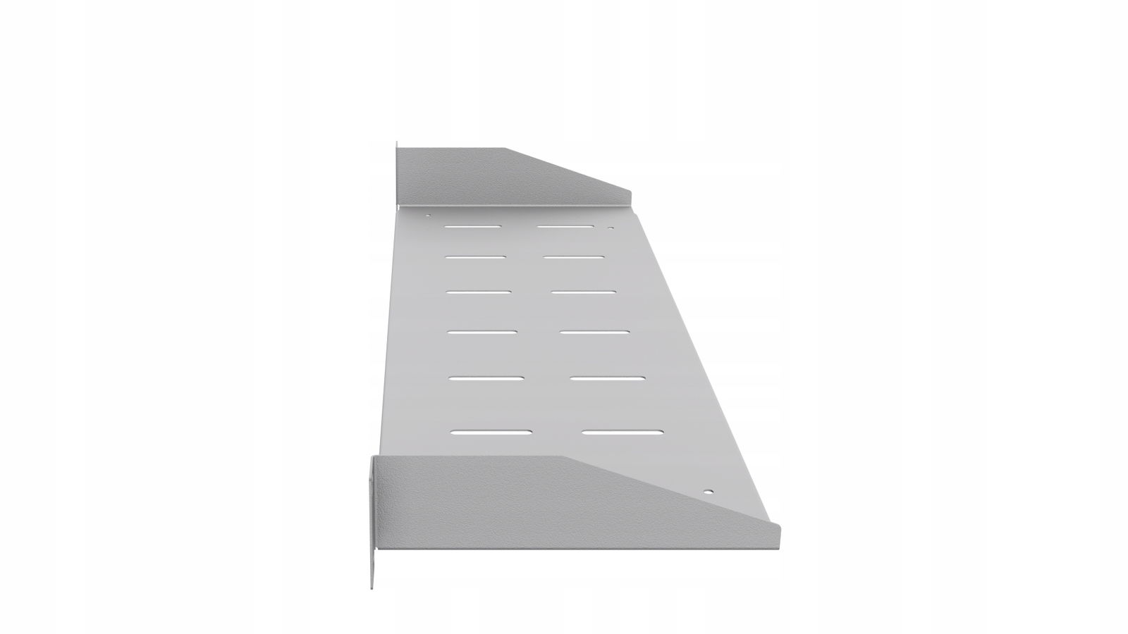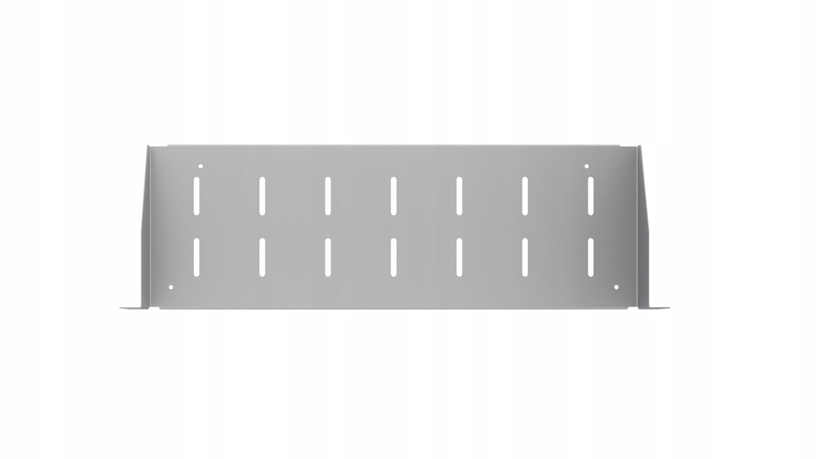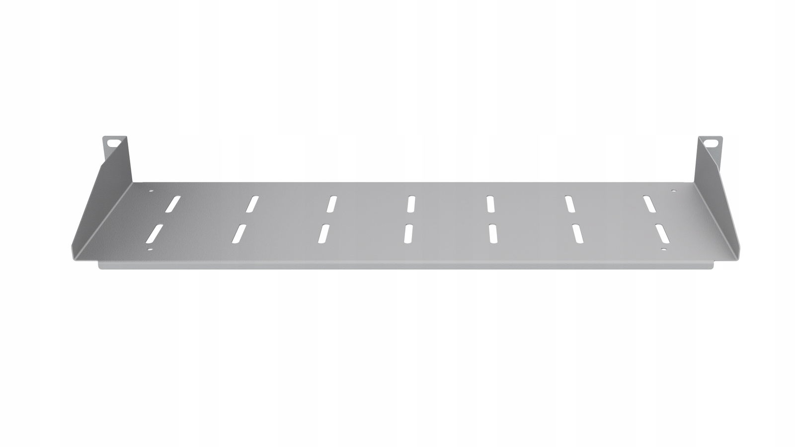 - Praktyczne otwory: Spód półki posiada perforacje, które umożliwiają łatwe przełożenie taśm rzepowych lub trytytek, co ułatwia montaż urządzeń. Perforacje pełnią również funkcję wentylacyjną, zapewniając odpowiednią cyrkulację powietrza.