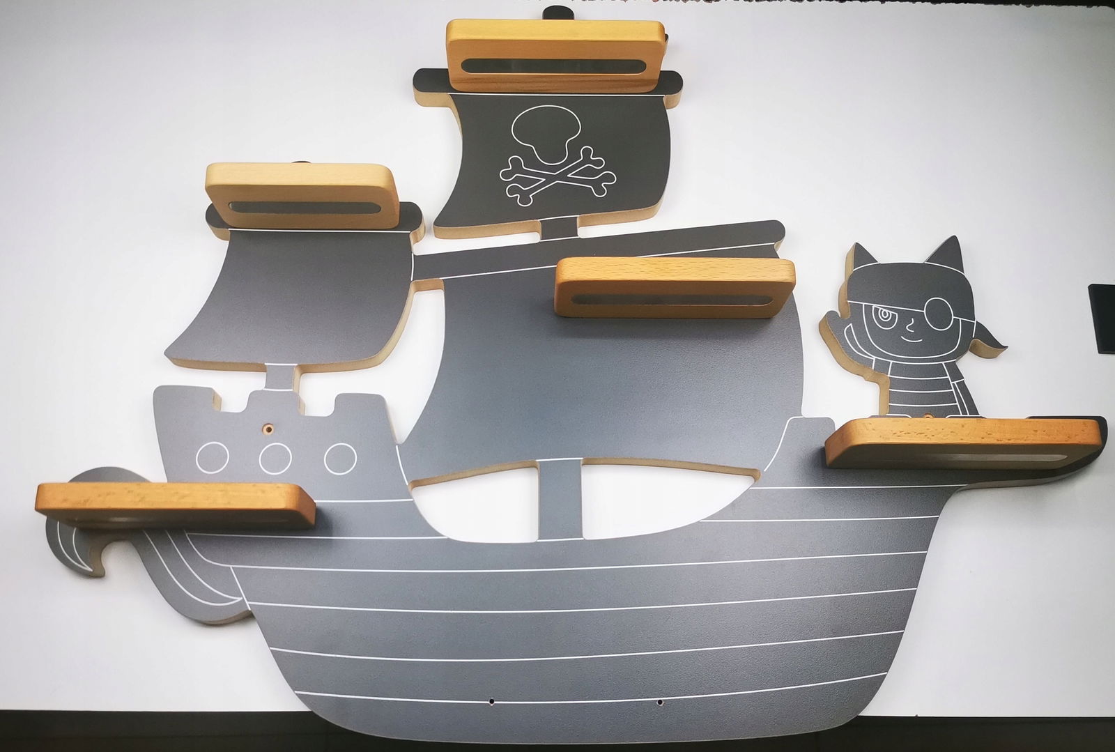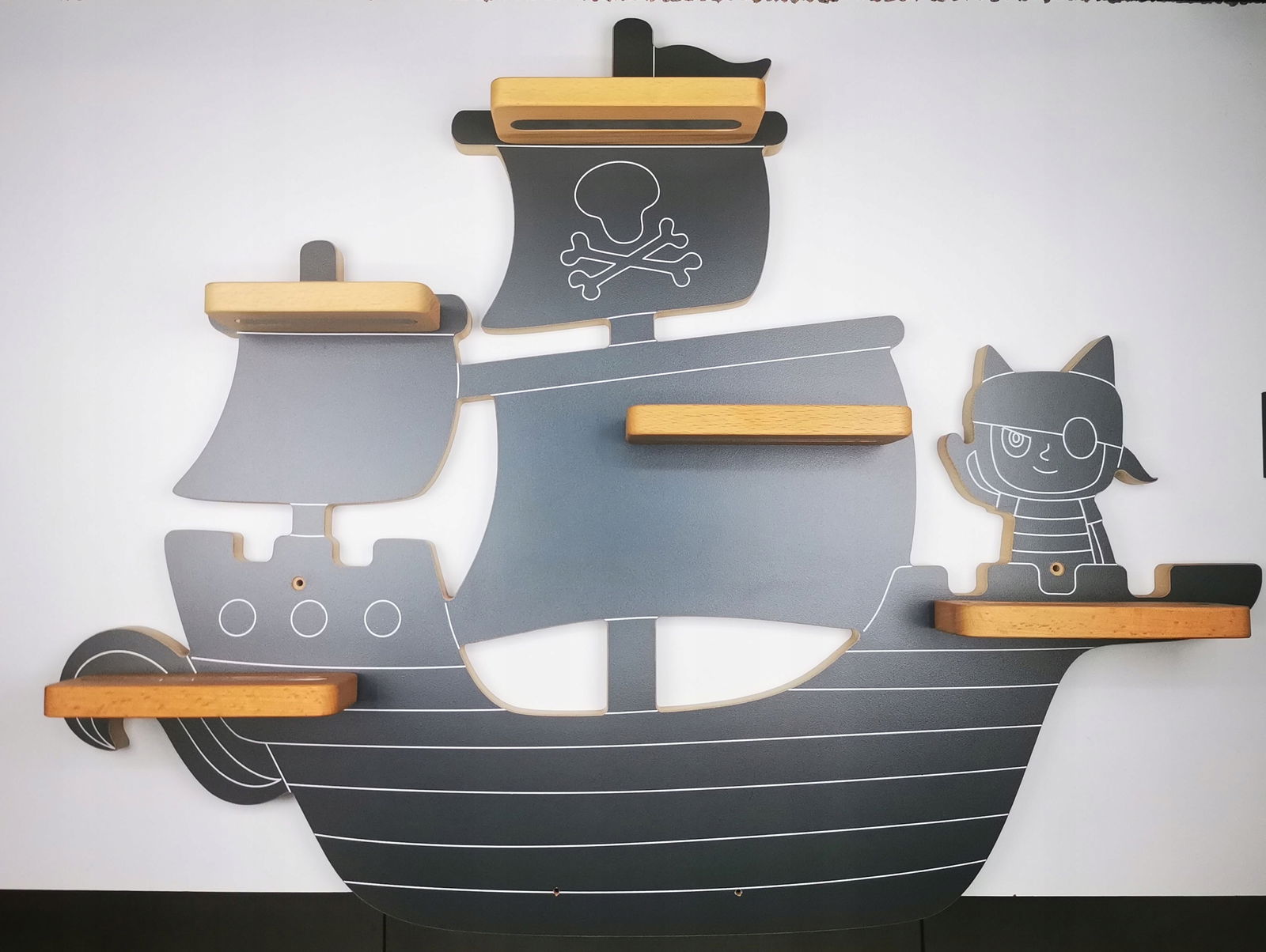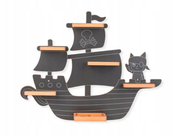 Estetyczny design: Półka przedstawiająca piracki statek na spokojnych wodach jest nie tylko praktyczna, ale także estetycznie przyjemna dla oka, idealna do pokoju dziecięcego.