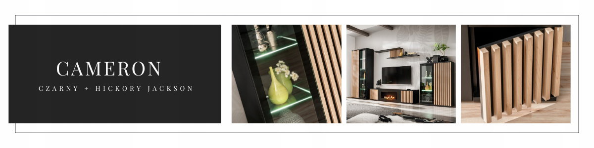 Meble CAMERON to elegancja w nowoczesnym wydaniu. Czarne, matowe korpusy przełamane naturalnymi lamelami w kolorze Hickory Jackson nadają wnętrzu wyrazistości i ciepła. Idealne do aranżacji nowoczesnych, industrialnych oraz loftowych przestrzeni.