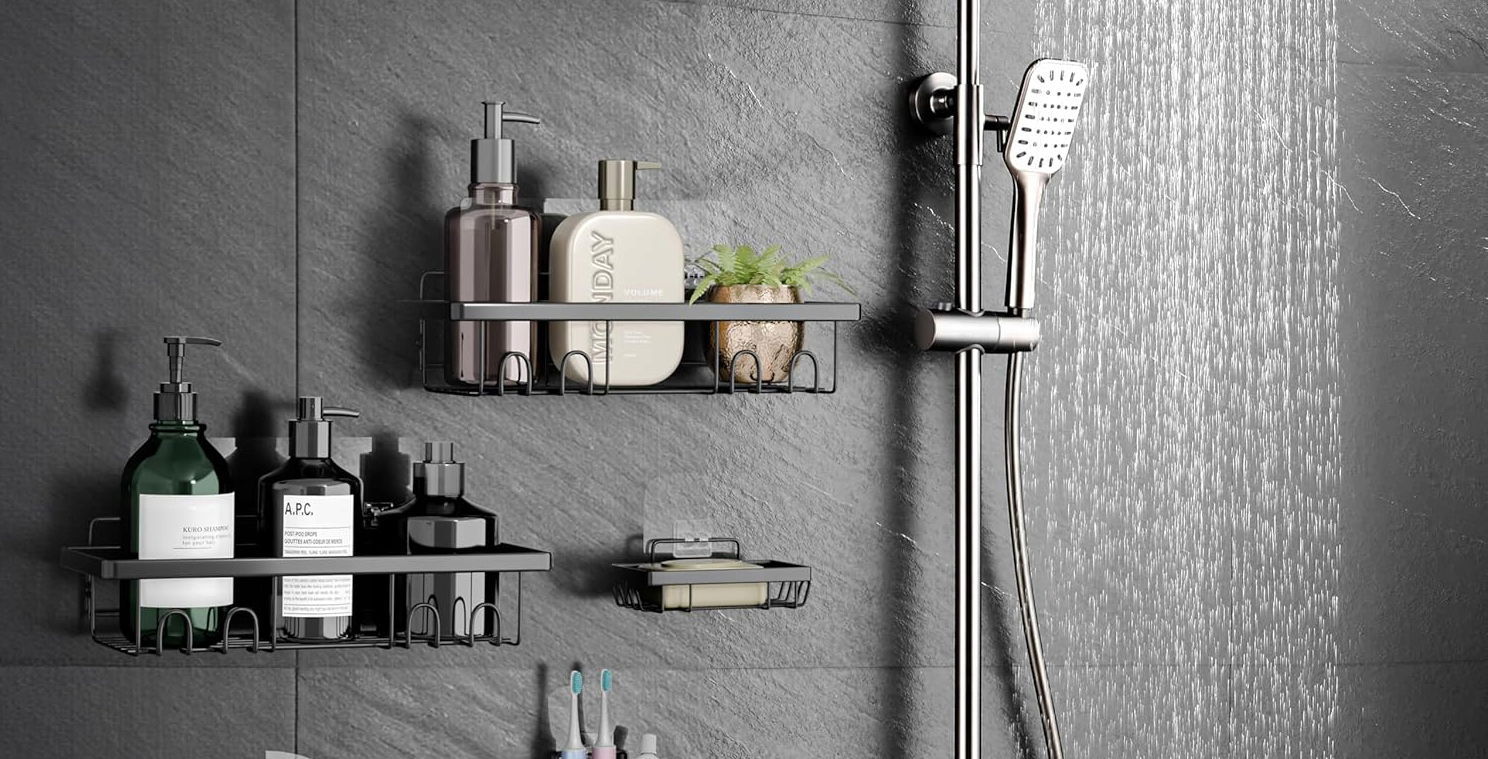 ✅ Zestaw 4 organizerów – różne rozmiary, idealne do szamponów, mydeł, gąbek i akcesoriów
