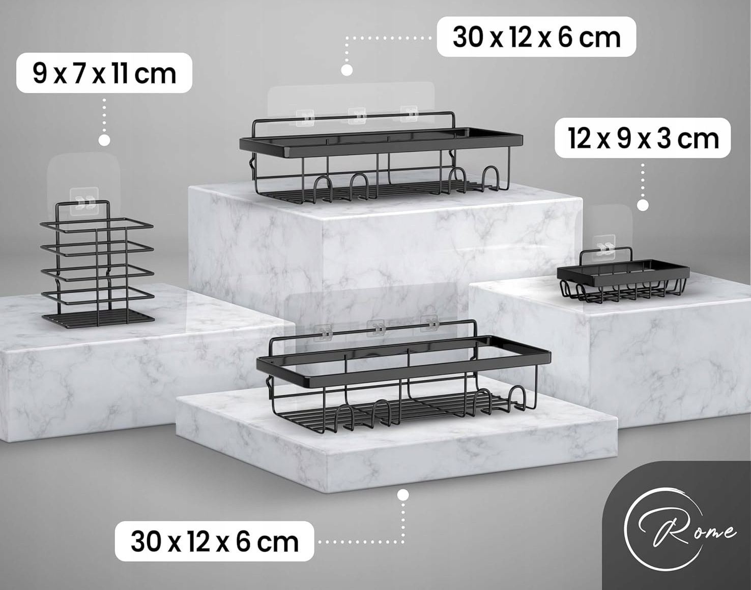 Rome Półka prysznicowa bez wiercenia – zestaw 4 szt. to praktyczny, elegancki i wytrzymały zestaw organizerów, który pozwoli Ci utrzymać porządek bez wiercenia i bałaganu. Doskonałe połączenie stylu i wygody!