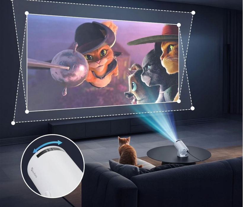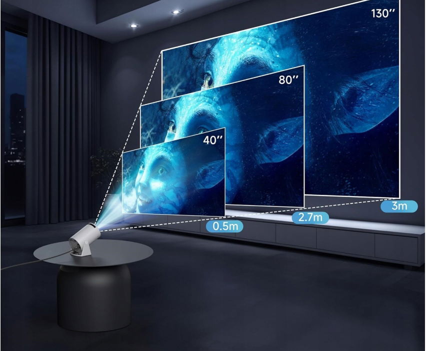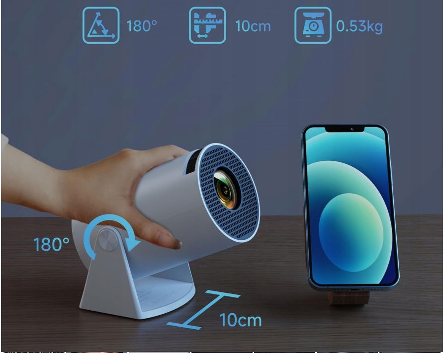 - Obrót o 180°: obrót o 180° sprawia, że projekcja ścienna/sufitowa/projekcja kampera / projekcja kempingu na zewnątrz jest dziecinnie prosta. Ponadto projektor zewnętrzny ma kompaktową konstrukcję, która jest prawie wielkości dłoni, a waga wynosi tylko 0,5 kg, dzięki czemu można go zabrać ze sobą wszędzie.