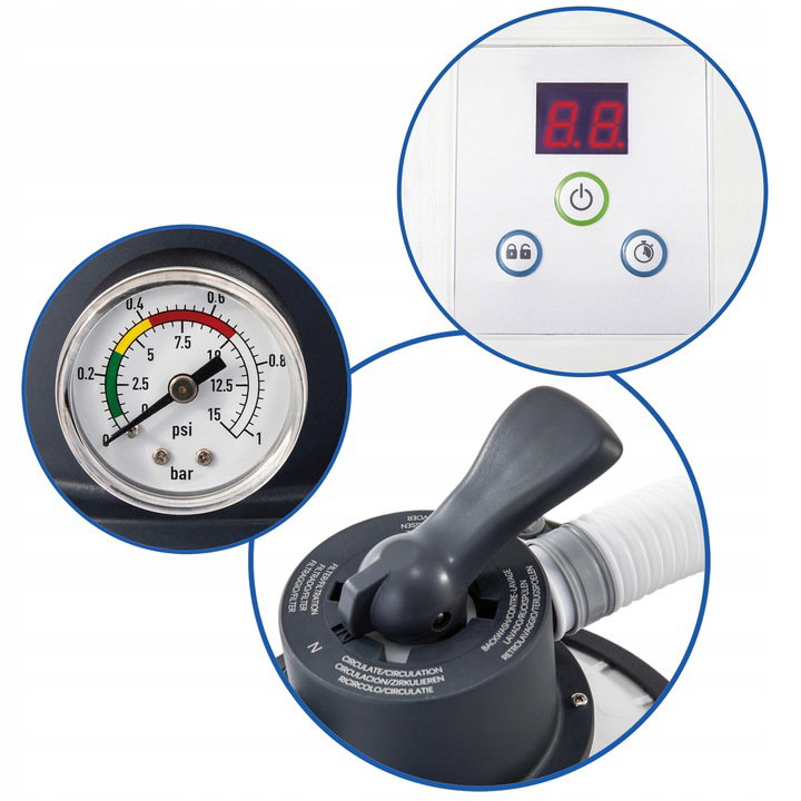- Wbudowany timer i ciśnieniomierz - ułatwiają kontrolę pracy urządzenia i pomagają w utrzymaniu optymalnej wydajności filtracji.