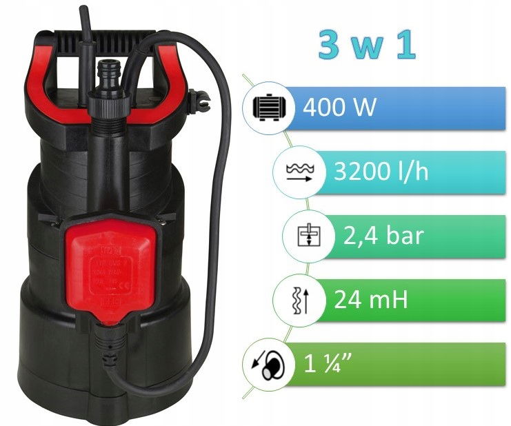 Produkt przeznaczony do użytku w ogrodzie, jak i również do osuszania zalanych pomieszczeń przydomowych. Wąska obudowa pompy oraz bezpośredni pionowy wylot daje możliwość pracy w wąskich szybach. Duże ciśnienie generowane przez pompę daje możliwość nawadniania ogrodu z funkcją podpięcia jednego obrotowego zraszacza. Największą zaletą produktu jest również dolny zasys cieczy, dzięki czemu jesteśmy w stanie wypompować wodę do poziomu 1 mm.