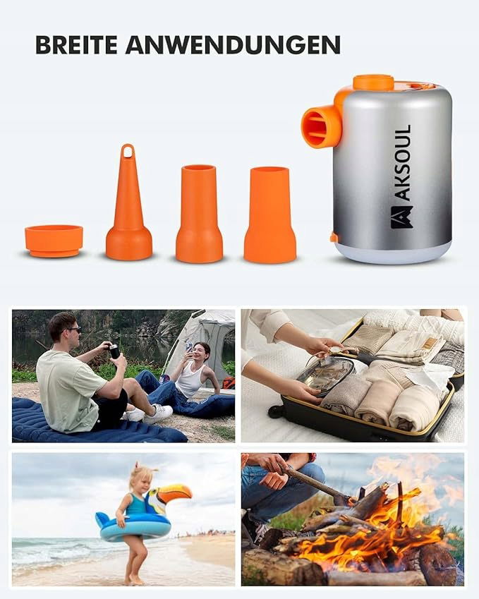 pompką jest dostarczany z trzema różnymi dyszami i nadaje się do nadmuchiwania i spuszczania różnych dużych i małych przedmiotów, takich jak materace, podkładki do spania, materace basenowe, nadmuchiwane sofy i worki próżniowe