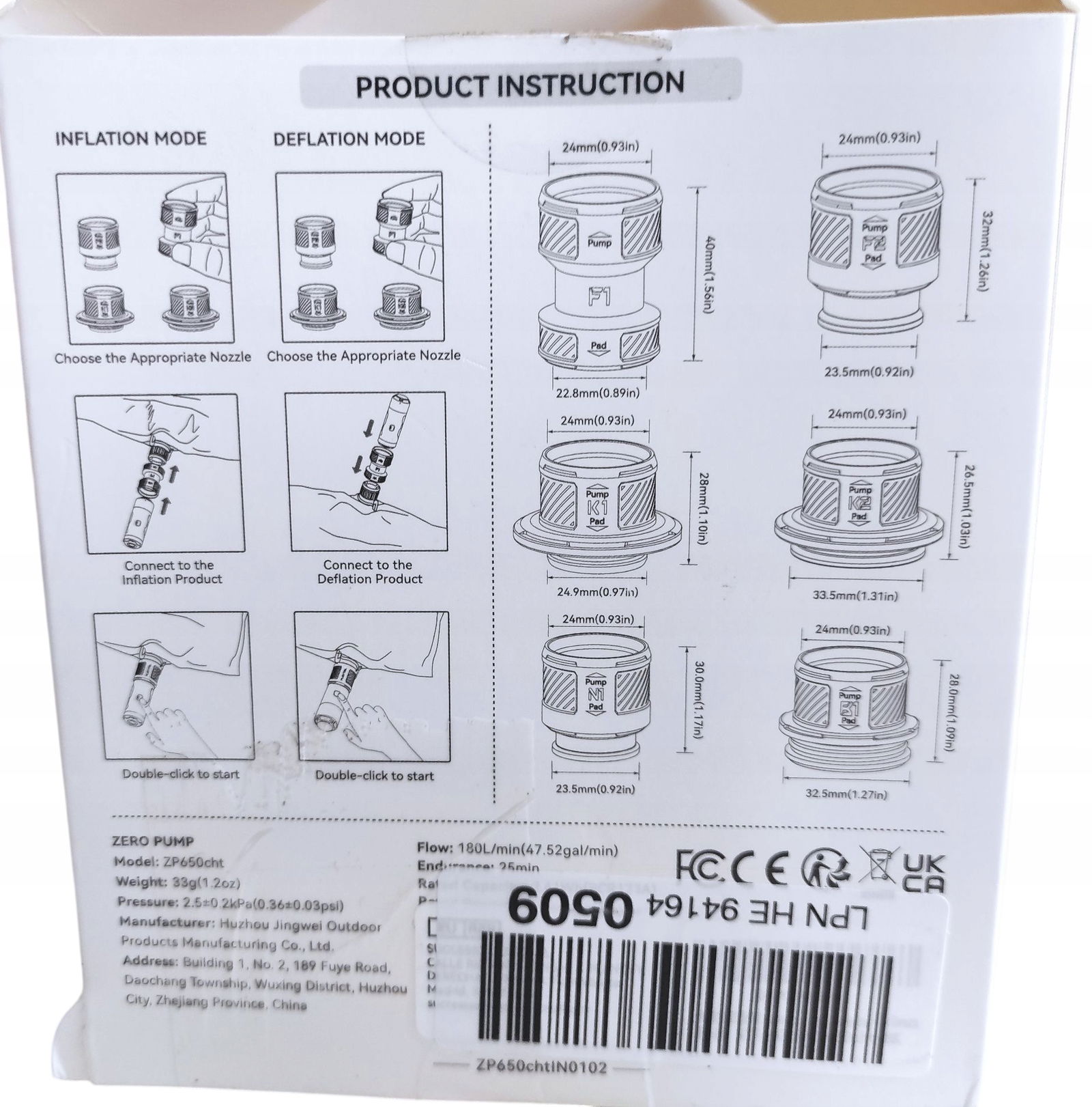Dołączony do zestawu akumulator RCR123A o pojemności 650 mAh zapewnia do 25 minut pracy i pozwala na napompowanie do 25 materacy. Wydajność pompowania wynosi 180 litrów na minutę. Pompka może być używana zarówno do pompowania, jak i do wypompowywania powietrza.