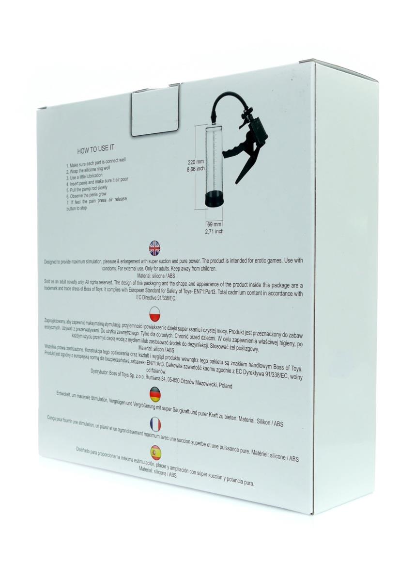 Pompa próżniowa przeznaczona dla mężczyzn, którzy szukają nowych możliwości. Regularne stosowanie powoduje wzrost rozmiarów członka i wzmocnienie erekcji. Wysoka jakość materiałów użytych do produkcji pompy sprawi, że zastosowanie produktu będzie przyjemne, bezpieczne i długotrwałe. Urządzenie jest wyposażone w wydajną pompę.