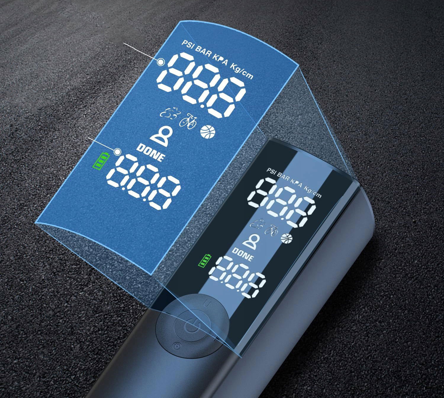 Różne tryby: Użyj jednego z czterech programowalnych trybów - rower, motocykl, piłka sportowa i tryb niestandardowy - aby napompować swoje opony. Tryb niestandardowy umożliwia również pompowanie opon samochodowych.