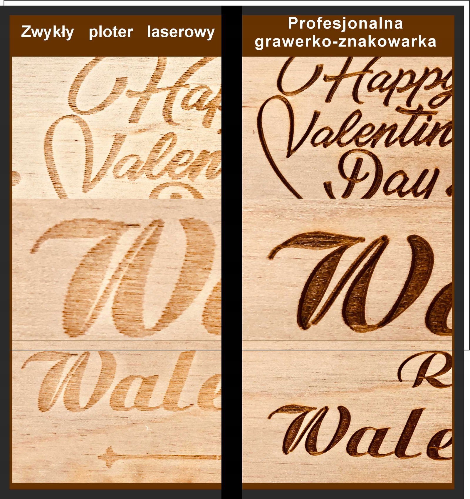 Różnicę między naszym produktem a produktami konkurencji przedstawimy na poniższej fotografii, na której widać dość wyraźną różnicę w jakości grawerunku jaka występuje podczas grawerowania ploterem laserowym a specjalistyczną znakowarką w której skok ścieżki promienia lasera w przypadku grawerowania sklejki ustawiamy na 0,01mm a ploterem laserowym CO2 w którym standardowy skok wynosi 0,2mm, co daje 20 razy większą dokładność odwzorowania i wyraziste kolory.