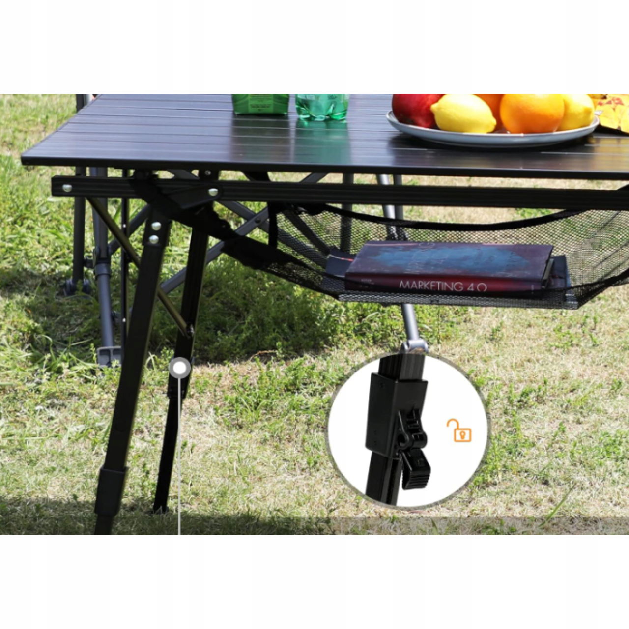Możliwość złożenia stołu pozwala na szybkie rozstawienie oraz wygodne przechowywanie w samochodzie lub domu.