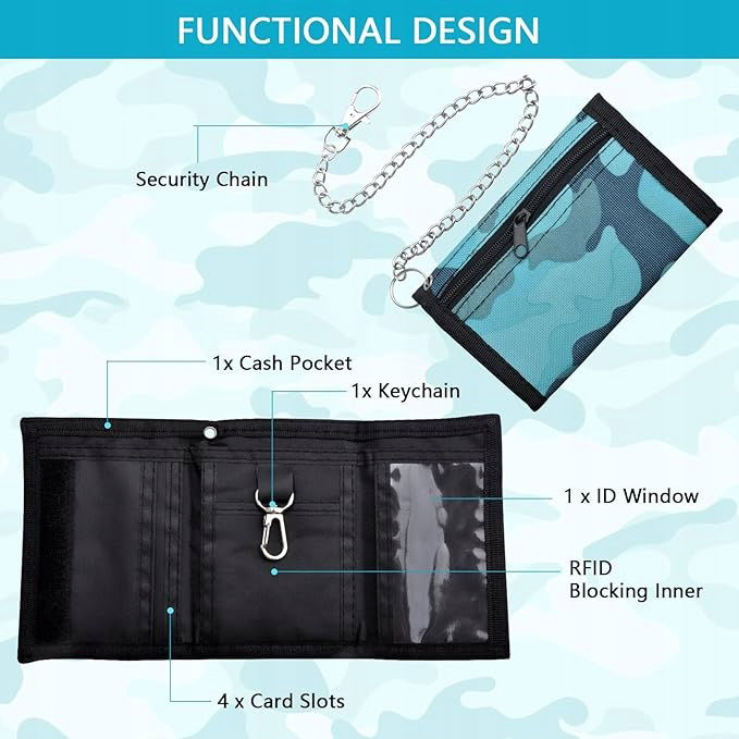 Portfel posiada 1 przezroczystą przegrodę na legitymację, 1 kieszeń na zamek błyskawiczny, 2 przegródki na karty kredytowe, 1 dodatkową przegrodę na karty, 1 mini kieszeń z siatki oraz łańcuszek z haczykiem. Wszystko zostało zaprojektowane z myślą o maksymalnej funkcjonalności, zapewniając bezpieczne przechowywanie najważniejszych przedmiotów, takich jak monety, banknoty, karty czy klucze. Łańcuszek z metalowym haczykiem umożliwia łatwe przypięcie portfela do paska, plecaka lub kluczy, co dodatkowo zwiększa jego praktyczność.
