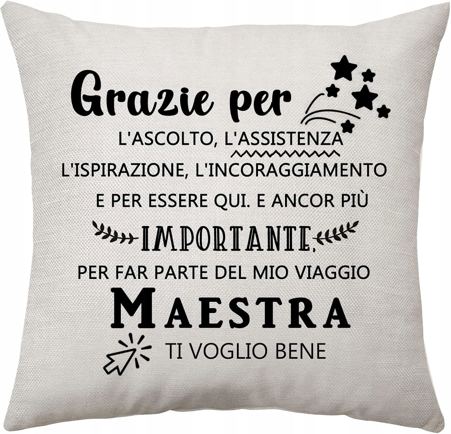 Chcesz wyrazić wdzięczność nauczycielowi, mentorowi lub pedagogowi, który miał wpływ na Twoje życie lub życie Twojego dziecka? Ta elegancka poszewka z napisem w języku włoskim to niebanalny i pełen ciepła gest, który zostanie zapamiętany na długo. Sprawdzi się idealnie jako prezent na zakończenie roku szkolnego, Dzień Nauczyciela lub po prostu – jako sympatyczne podziękowanie.