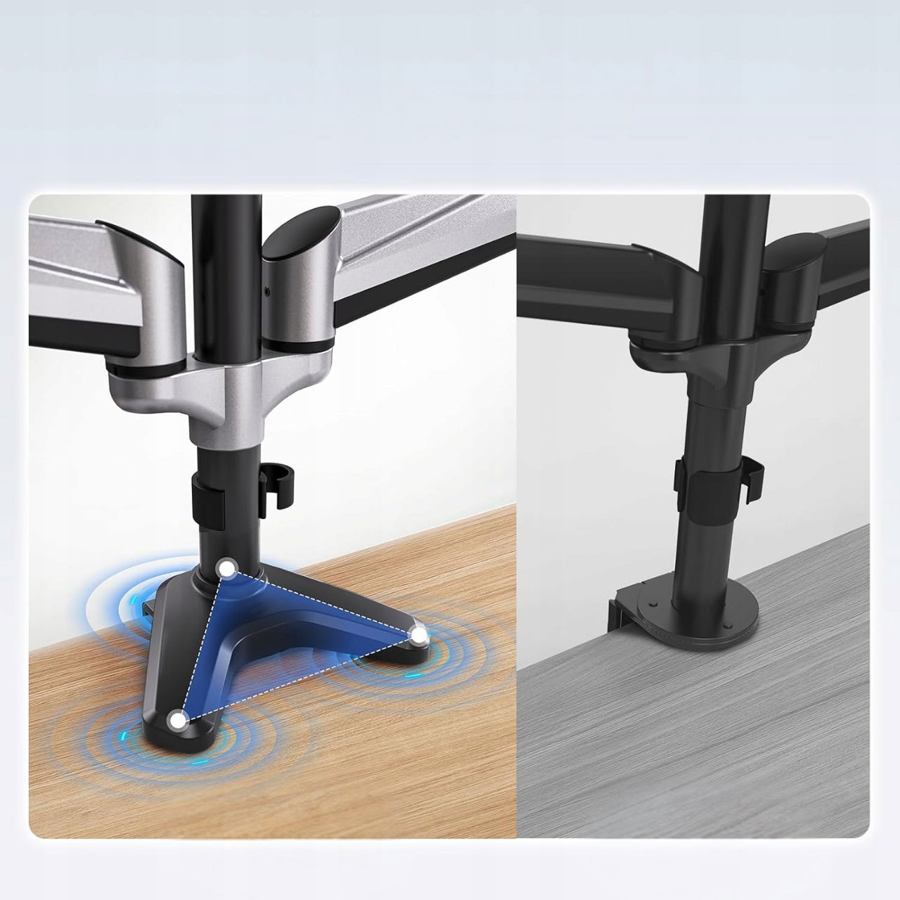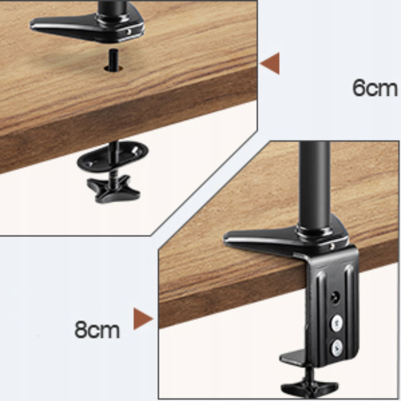 ✅ Dwie opcje montażu możliwość instalacji za pomocą zacisku C lub przelotki, co zapewnia kompatybilność z różnymi rodzajami biurek i stabilne przymocowanie monitora.