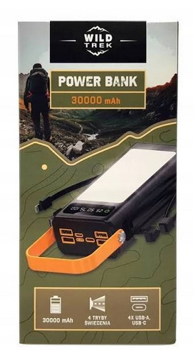 Power bank marki Wild Trek o pojemności 30 000mAh (30Ah) z wbudowaną latarką z 4 trybami świecenia (tryb 100% jasności, tryb 75% jasności, tryb stroboskop, tryb SOS). Powerbank posiada wbudowany akumulator Litowo-Polimerowy o napięciu 3,7V i pojemności 30 000mAh (111Wh). W zestawie znajdują się 3 kable: 1x kabel do ładowania (USB-USB-C), 1x kabel Lighting (wpięty w powerbank) oraz 1x kabel USB-C (wpięty w powerbank). Urządzenie posiada 3 złącza do ładowania powerbanku: microUSB, USB-C oraz port Lighting. Ponadto powerbank do ładowania podłączonych do niego urządzeń posiada: 1x złącze Lighting z wpiętym kablem (5V, 2,4A, 12W), 1x USB-C z wpiętym kablem (5V, 3A, 15W lub 9V, 2A, 18W lub 12V, 1,5A 18W), 1x port USB-A (5V, 3A, 15W lub 9V, 2A, 18W lub 12V, 1,5A 18W) oraz 3x port USB-A (5V, 2A, 10W). Ponadto produkt posiada wygodny uchwyt do przenoszenia.
