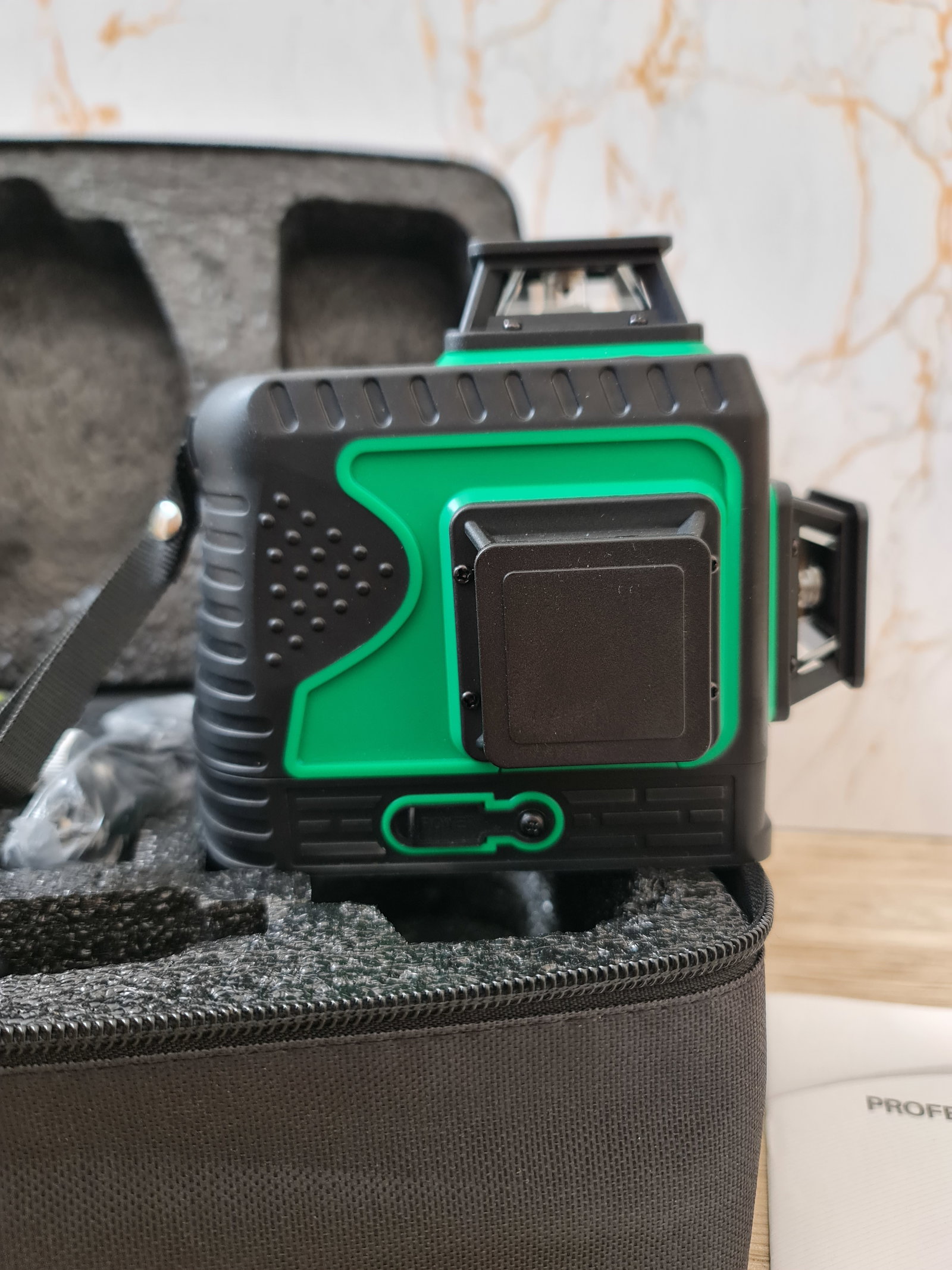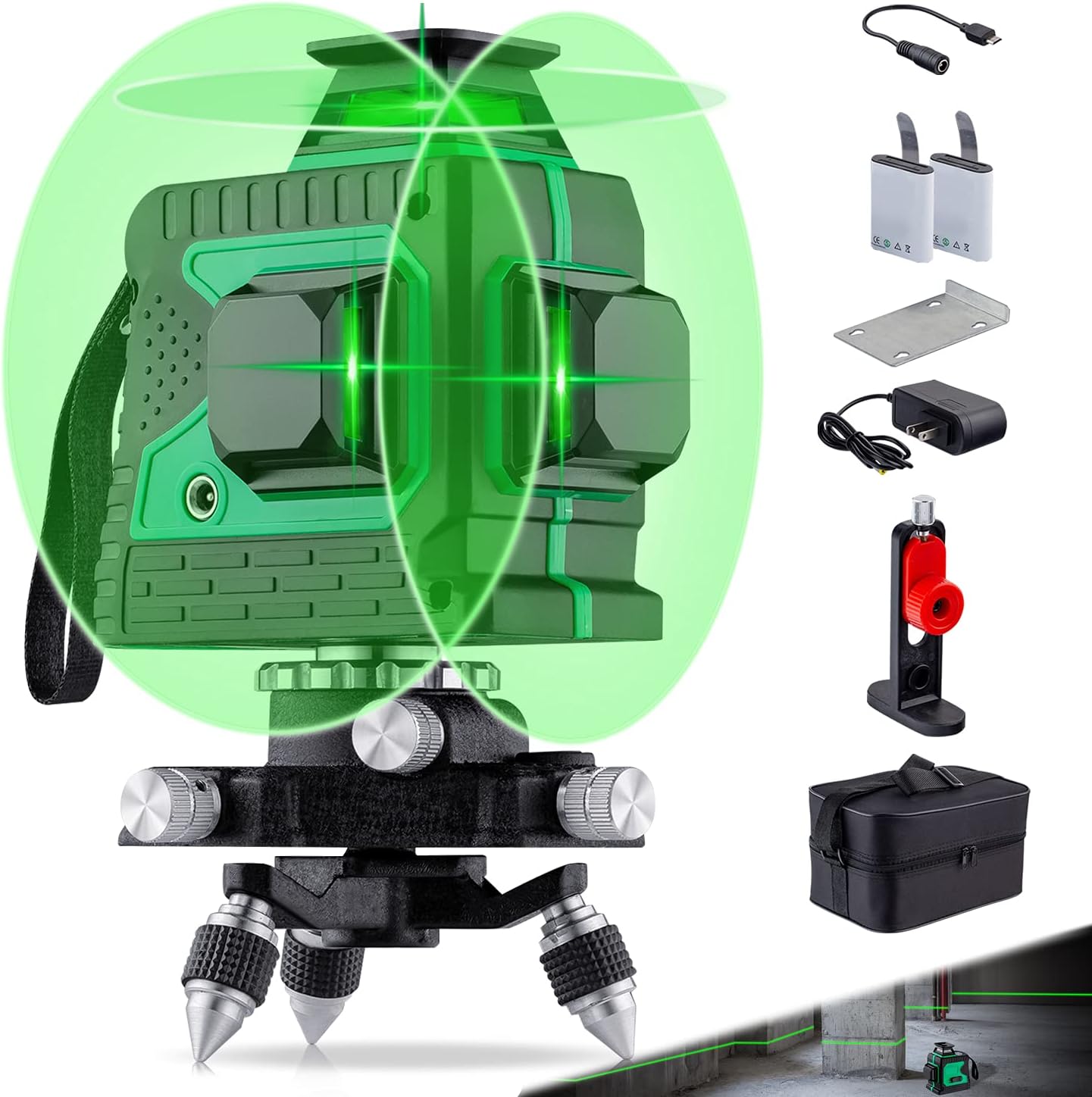 Poziomica Laserowa liniowa, 12 linii, laser krzyżowy, 3 x 360, samopoziomujący, laser rotacyjny, do ponownego napełniania, zielony. Produkt powystawowy, posiada nieznaczne ryski