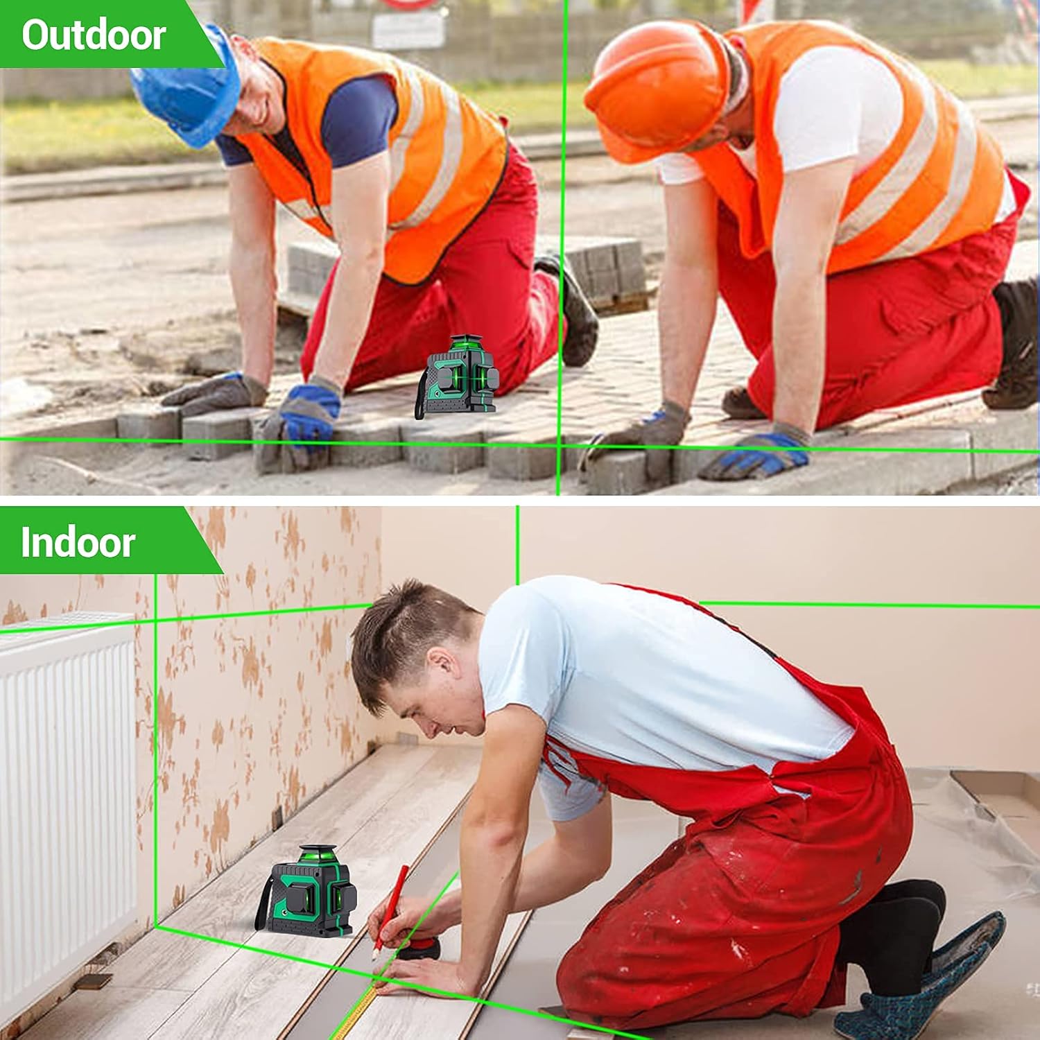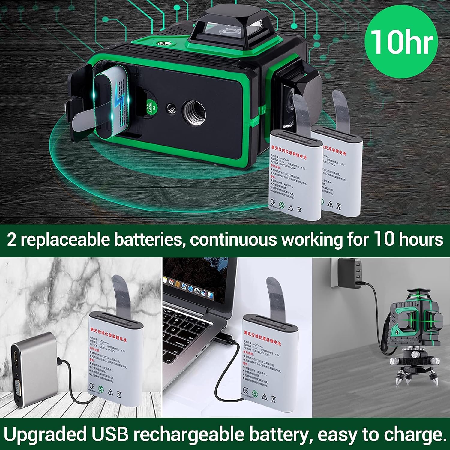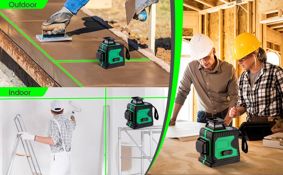 Ulepszenie długiej żywotności baterii o dużej pojemności i trybie pulsacyjnym na zewnątrz: Ten laser liniowy precyzyjnie projektuje jaśniejszy zielony laser niż tradycyjne czerwone wiązki. Gdy tryb impulsowy jest włączony, narzędzie laserowe może być używane z detektorem laserowym do pracy w jeszcze jaśniejszym otoczeniu lub przy większych odległościach roboczych. Urządzenie jest dostarczane z dwoma akumulatorami 4000 mAh, które umożliwiają do 10 godzin ciągłej pracy.