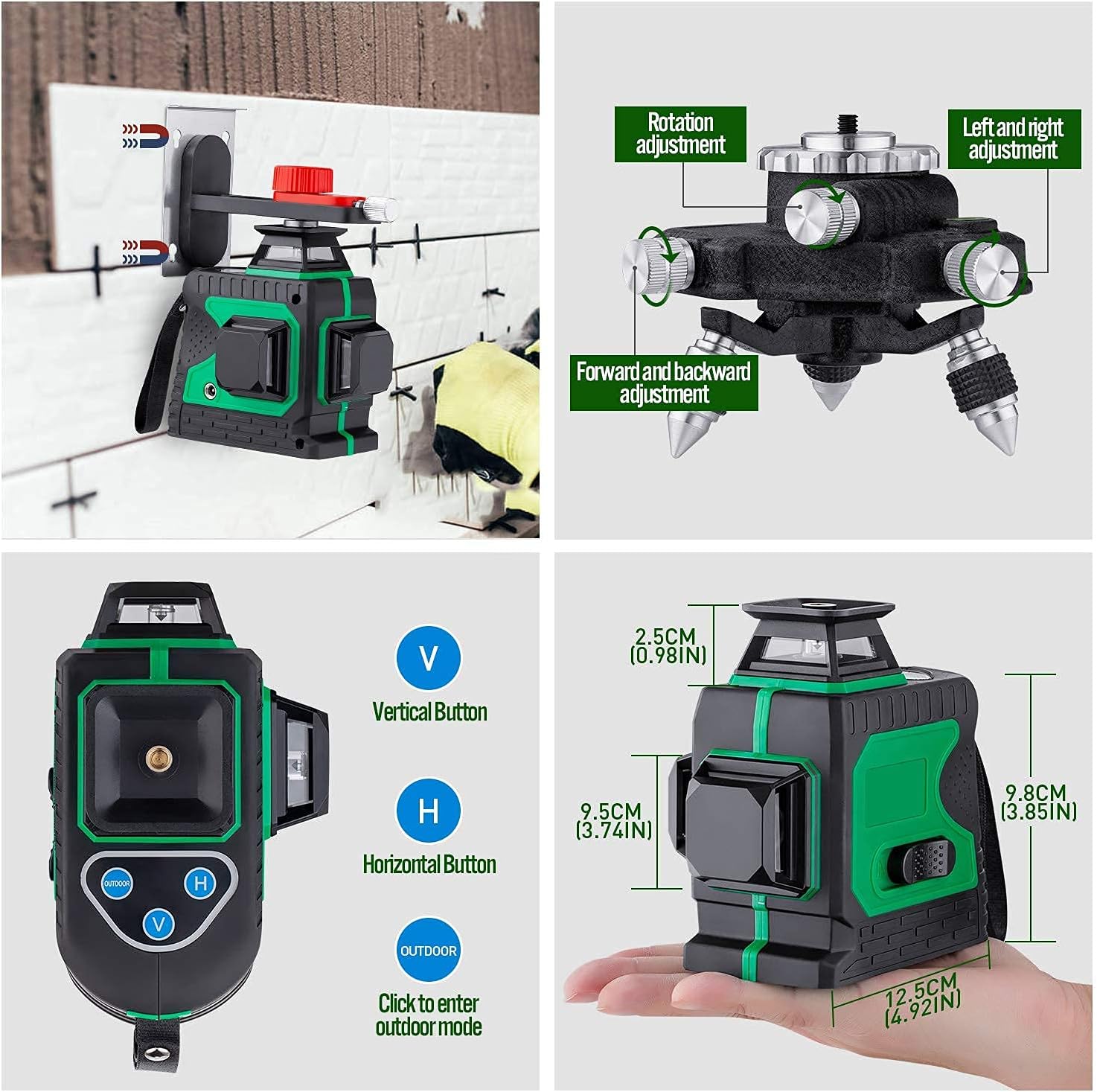 Wiele trybów i łatwa obsługa: Pięć trybów można dowolnie wybierać, w tym tryb poziomy, pionowy, poziomy i pionowy. Wystarczy nacisnąć przycisk zasilania, aby aktywować urządzenie i po prostu wyświetlić zielony laser.