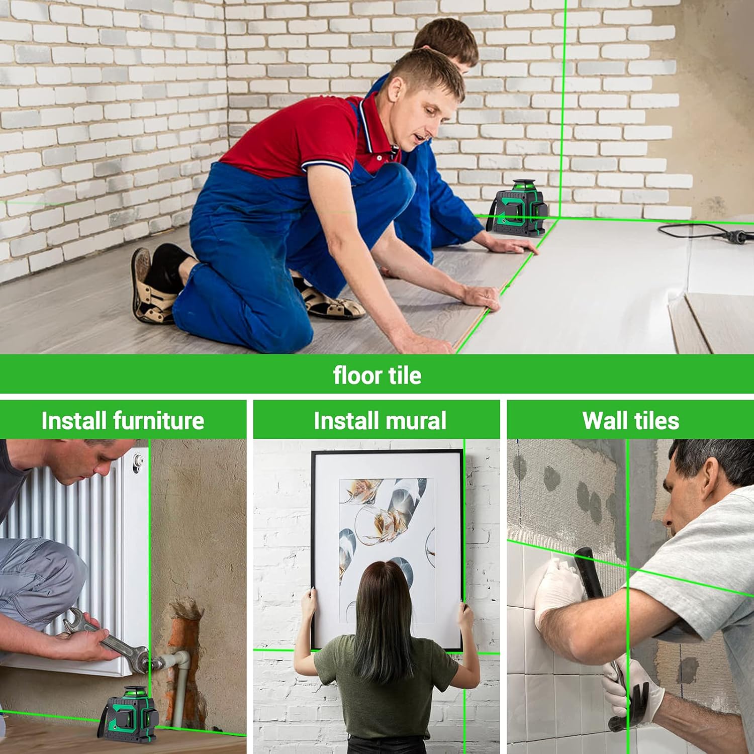 Jest wodoszczelna i pyłoszczelna, nadaje się do każdego otoczenia. Ulepszona głowica laserowa MC z lepiej widoczną zieloną linią, zaprojektowana do użytku na zewnątrz. Z funkcją automatycznego poziomowania, w przeciwnym razie rozlega się sygnał ostrzegawczy. Z 12 zielonymi liniami poziomymi, 360° bez martwego kąta. 7 mm szczelności na ścianie, dokładniej, aby naprawdę pasował do ściany.