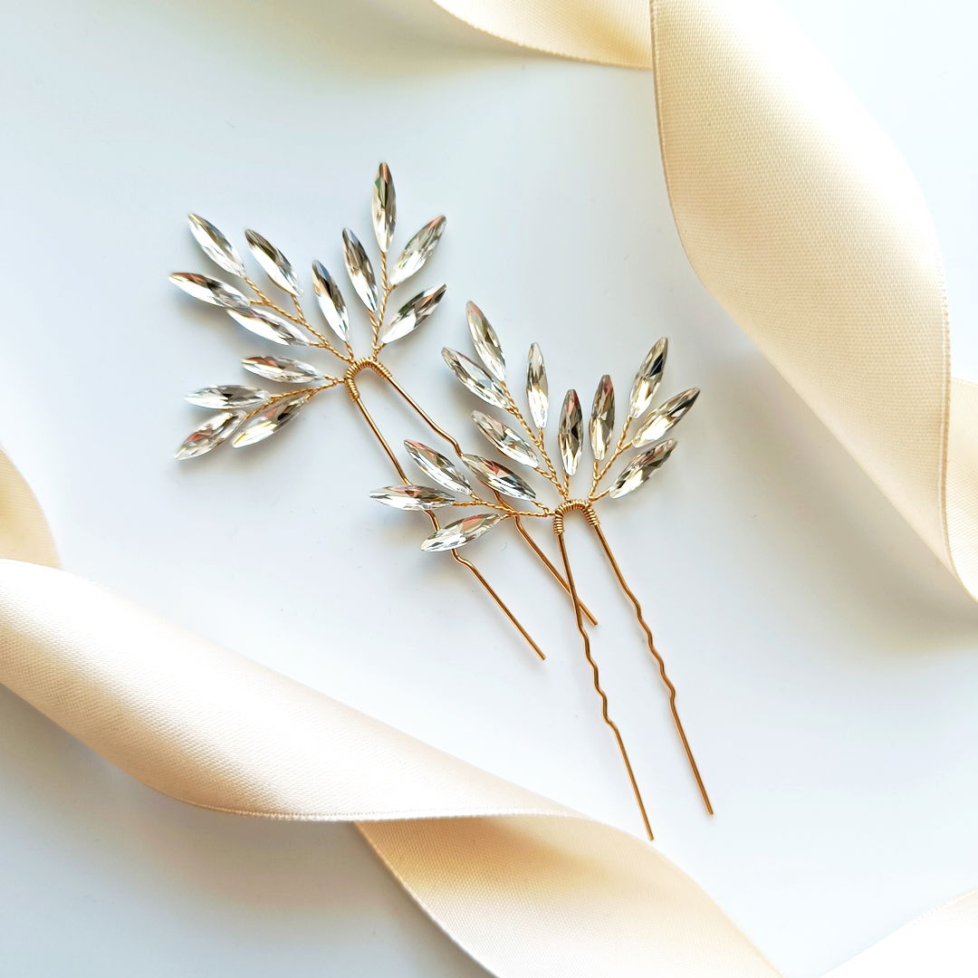 Umiejętnie dobrana ozdoba do włosów tworzy spójną całość i podkreśla elegancję ślubnej stylizacji. Ten błyszczący duet złotych biżuteryjnych szpilek z pewnością będzie widoczny, i doda charakteru każdej fryzurze.