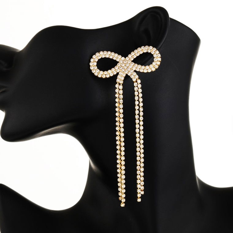 Długie i efektowne kolczyki w kształcie kokardek to kolczyki, które powinna mieć w swojej szkatułce każda modowa królowa. Złote cyrkoniowe nitki swobodnie wiszą, a kokardka przy uchu jest sztywna, dzięki czemu nie straci swojego kształtu, a Ty zostaniesz zauważona już z daleka, bo te kolczyki pięknie się błyszczą.