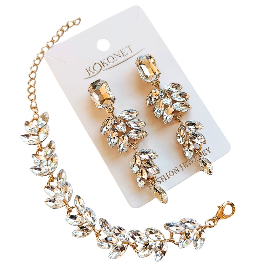 Pozłacany zestaw kryształowej biżuterii kolczyki bransoletka z listkami