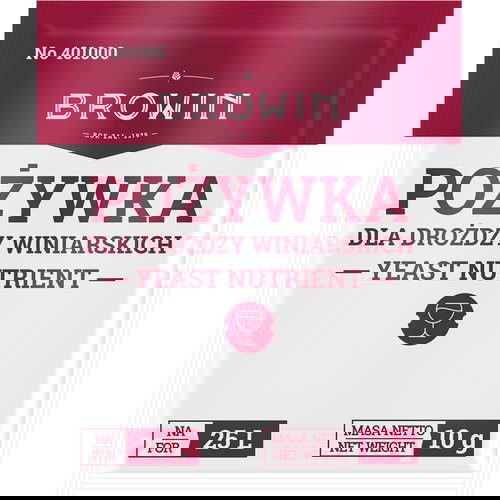 Do prawidłowego rozwoju drożdże winiarskie poza źródłem cukru potrzebują, także związków azotowych i fosforowych, w które ubogie są owoce naszego klimatu. Dzięki zastosowaniu Pożywki zyskujemy odpowiednie namnożenie drożdży, szybkie rozpoczęcie fermentacji, a także pełne odfermentowanie cukru zawartego w owocach i dodanego w czasie produkcji wina. Związki zawarte w pożywkach są wykorzystywane całkowicie przez drożdże w trakcie ich namnażania, więc nie wpłyną na smak i aromat wina oraz na zdrowie człowieka.Istotne cechy: Gramatura 10 g Na 25 L nastawuSposób użycia: Stosować w proporcji 1g Pożywki na 1,5-2,5L moszczu. Zawartość torebki wystarcza na 15-25L nastawu wina. Zalecaną ilość pożywki należy dawkować w trzech równych porcjach: I – przed zaszczepieniem drożdżami, II – po 2-3 dniach fermentacji, III – po ok. 10 dniach, gdy °Blg moszczu spadnie do 8-12. Porcje pożywki rozpuścić w ok. 100 ml moszczu, a następnie wlać do pojemnika fermentacyjnego i wymieszać. Nie dodawać pożywki bezpośrednio do szczepionki drożdży.Składniki: wodofosforan (V) diamonu Masa netto: 10 g