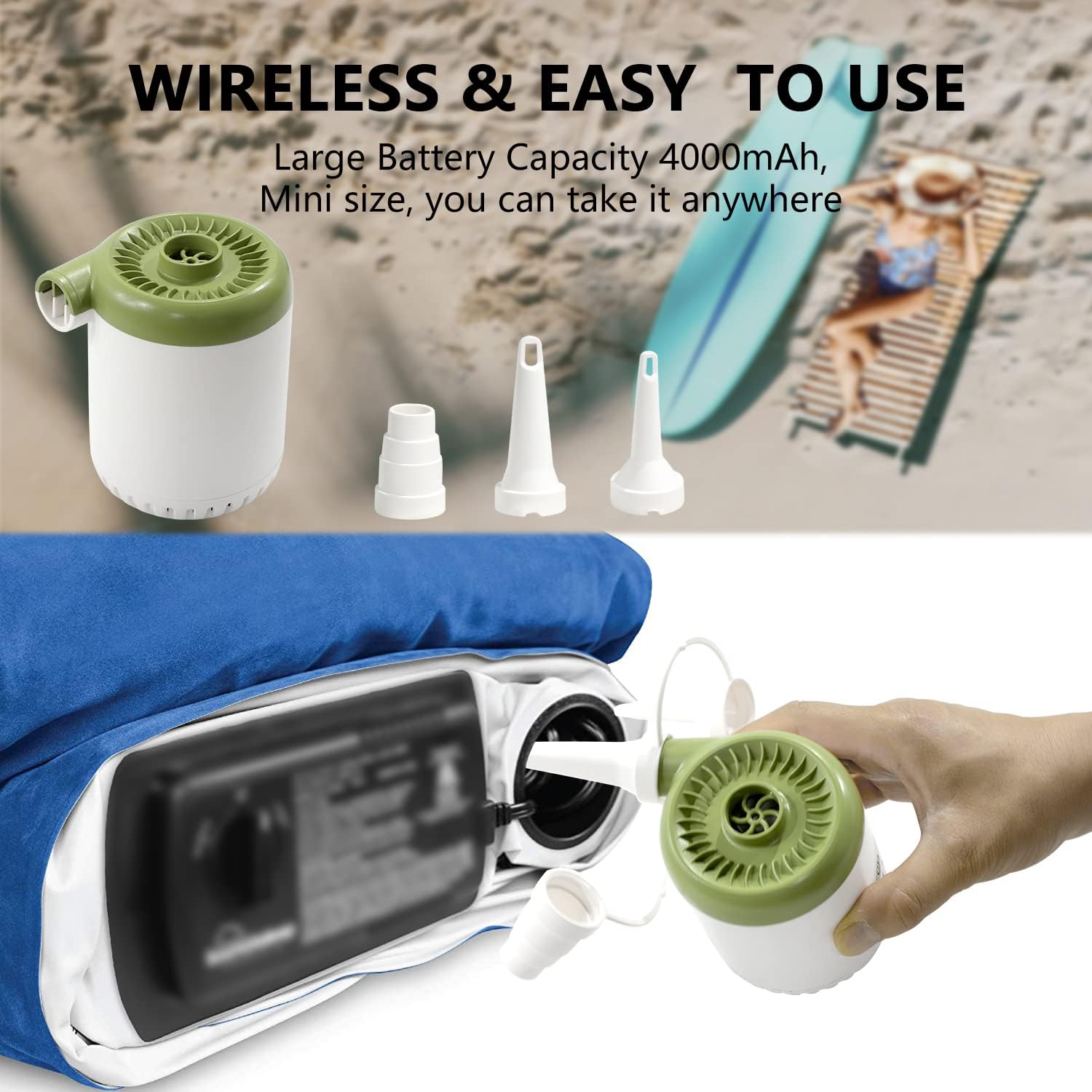 Wyposażona we wbudowany akumulator o pojemności 4000 mAh - ta pompa materaca powietrznego może pracować nieprzerwanie przez 45 minut w trybie nadmuchiwania lub deflacji, 12 godzin w trybie światła kempingowego po pełnym naładowaniu. Dzięki interfejsowi ładowania typu C bezprzewodowa pompa powietrza może być szybko ładowana przez power bank, laptop, port USB samochodu, gdy jest na zewnątrz lub ładowana przez zasilacz w domu.