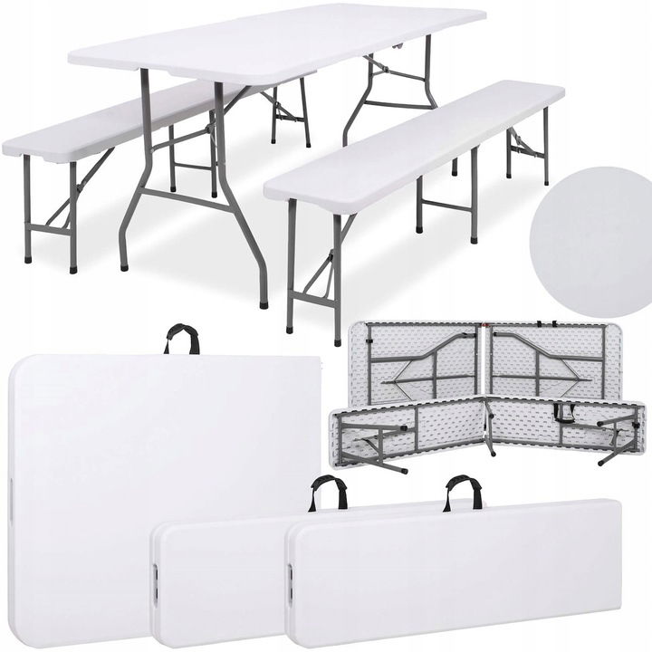 Ten funkcjonalny zestaw, składający się z składanego stołu i dwóch ławek, to idealne rozwiązanie na różnorodne okazje, takie jak przyjęcia w ogrodzie, bankiety, pikniki czy wyjazdy turystyczne.
