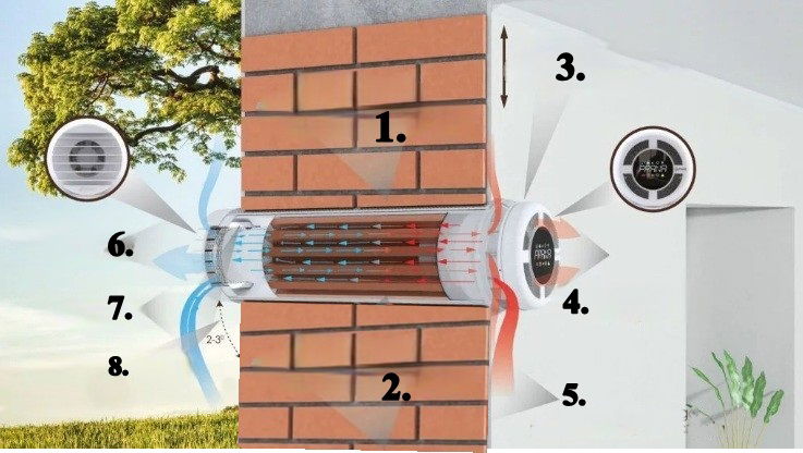 - SKUTECZNOŚĆ WYNOSI DO 98% : osiągana jest dzięki przechodzeniu strumieni powietrza wylotowych i wlotowych, zmierzających w przeciwnym kierunku i nie krzyżujących się wzajemnie, przez system miedzianego wymiennika ciepła.