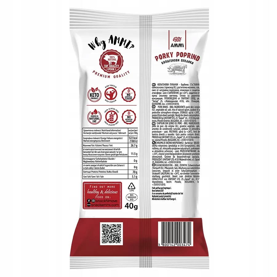 AMMI PORKY POPRIND jest produkowany z wysokiej jakości 100% naturalnych surowców przy pełnej kontroli procesu produkcji. Zawartość białka w postaci kolagenu wynosi 70%. Produkt NIE zawiera glutenu, węglowodanów i cukru.