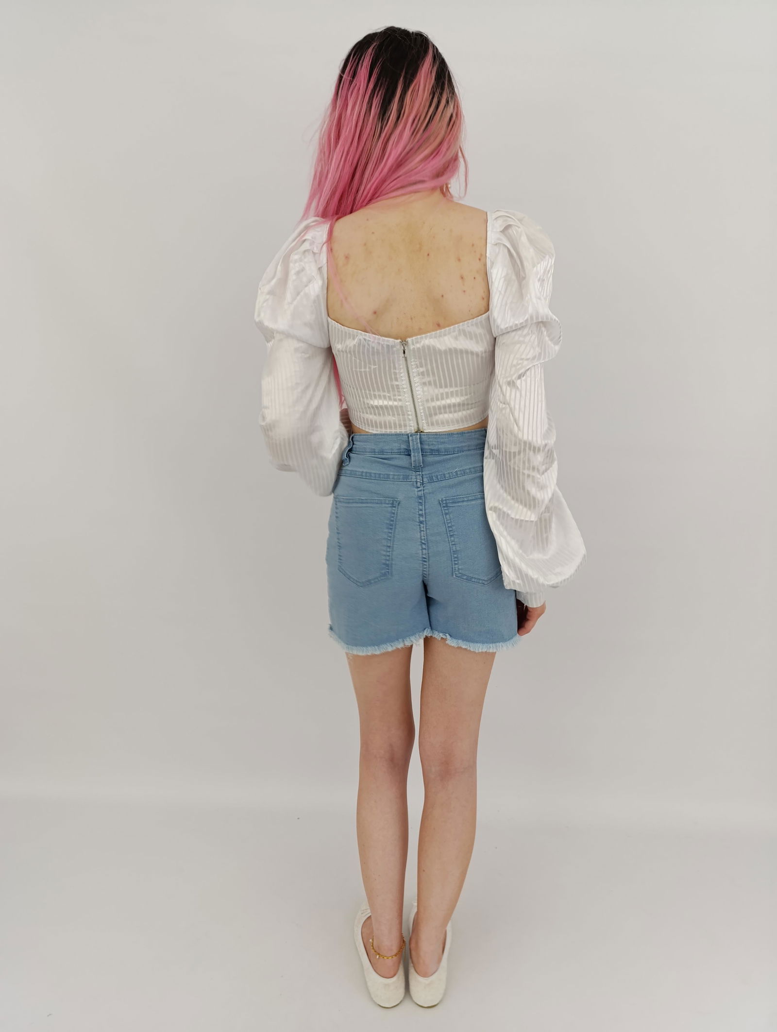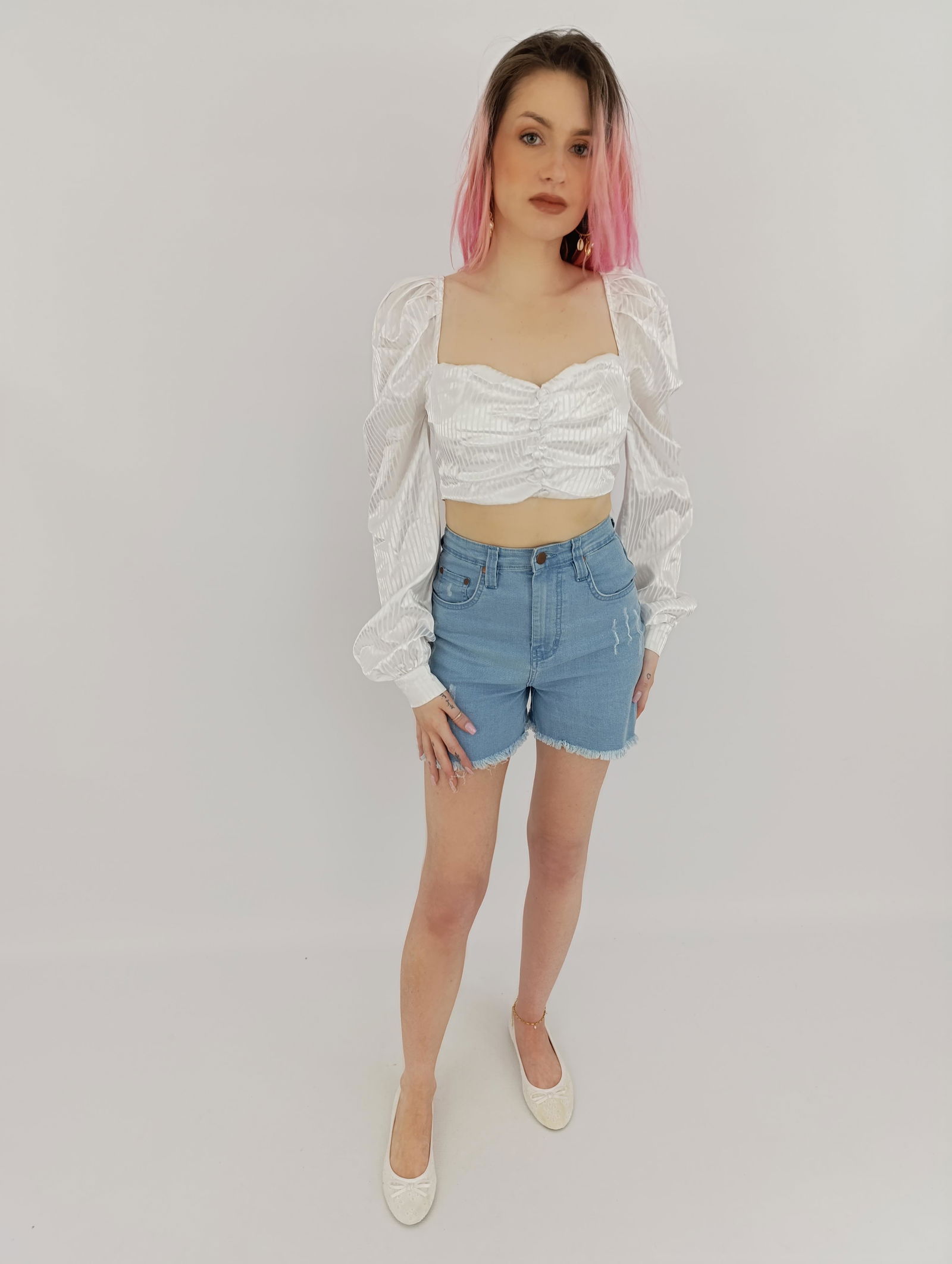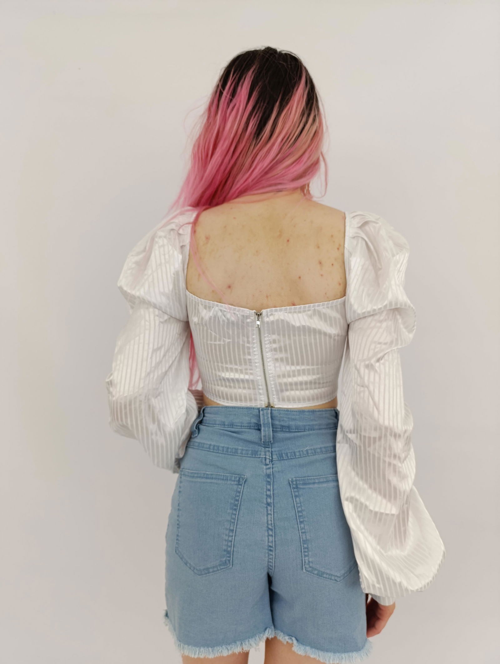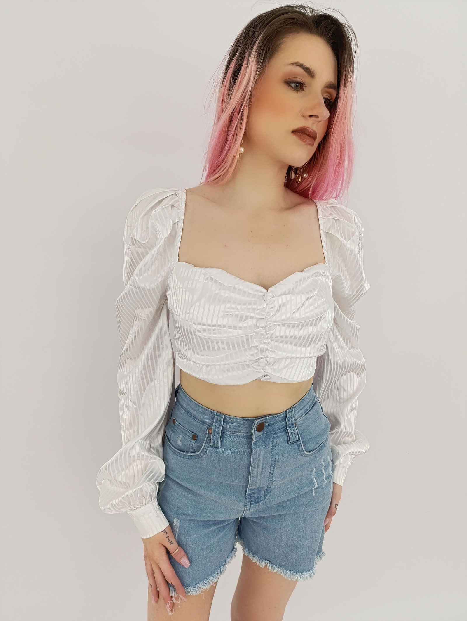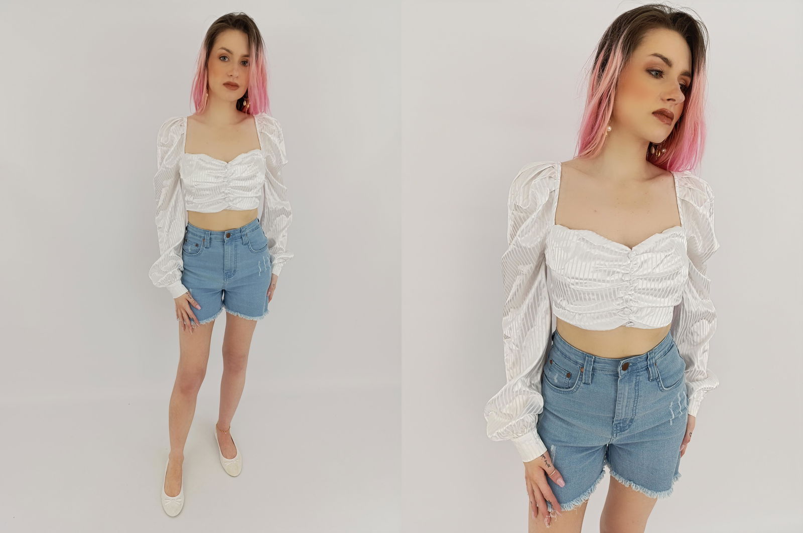 Bluzka damska marki PrettyLittleThing, idealna na lato. Satynowy crop top w kolorze białym z bufkami i paskami. Doskonała propozycja na letnie wieczory.