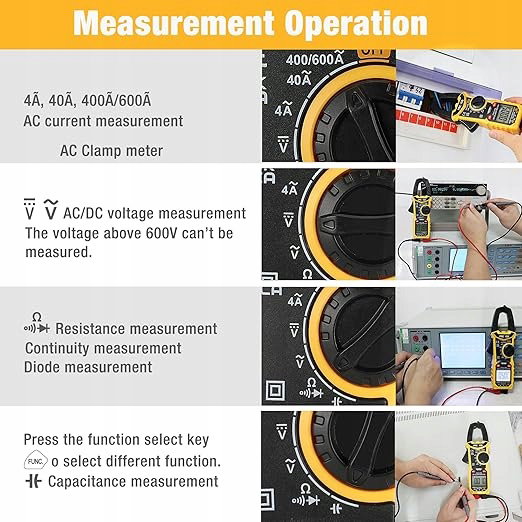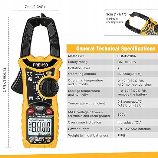 Główne parametry - nowa generacja wydajnych cyfrowych urządzeń zaciskowych True-RMS o podwójnej impedancji, które integrują wiele funkcji, czynią Twoją pracę łatwiejszą, wydajniejszą i bezpieczniejszą. Może być używany do pomiaru napięcia AC/DC prądu AC, przejścia, oporu, diody i pojemności. Napięcie AC/DC do 600 V, prąd AC do 600 A, opór do 40 MΩ, pojemność do 4 mF. True RMS. CAT.III 600V