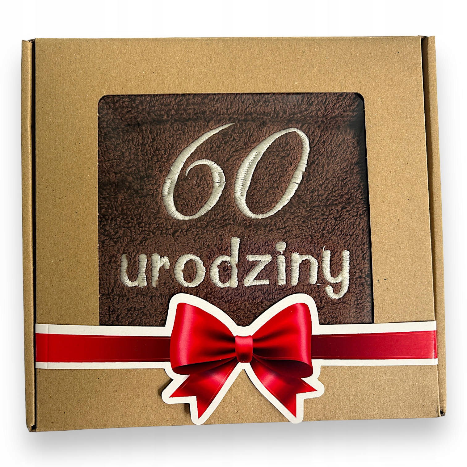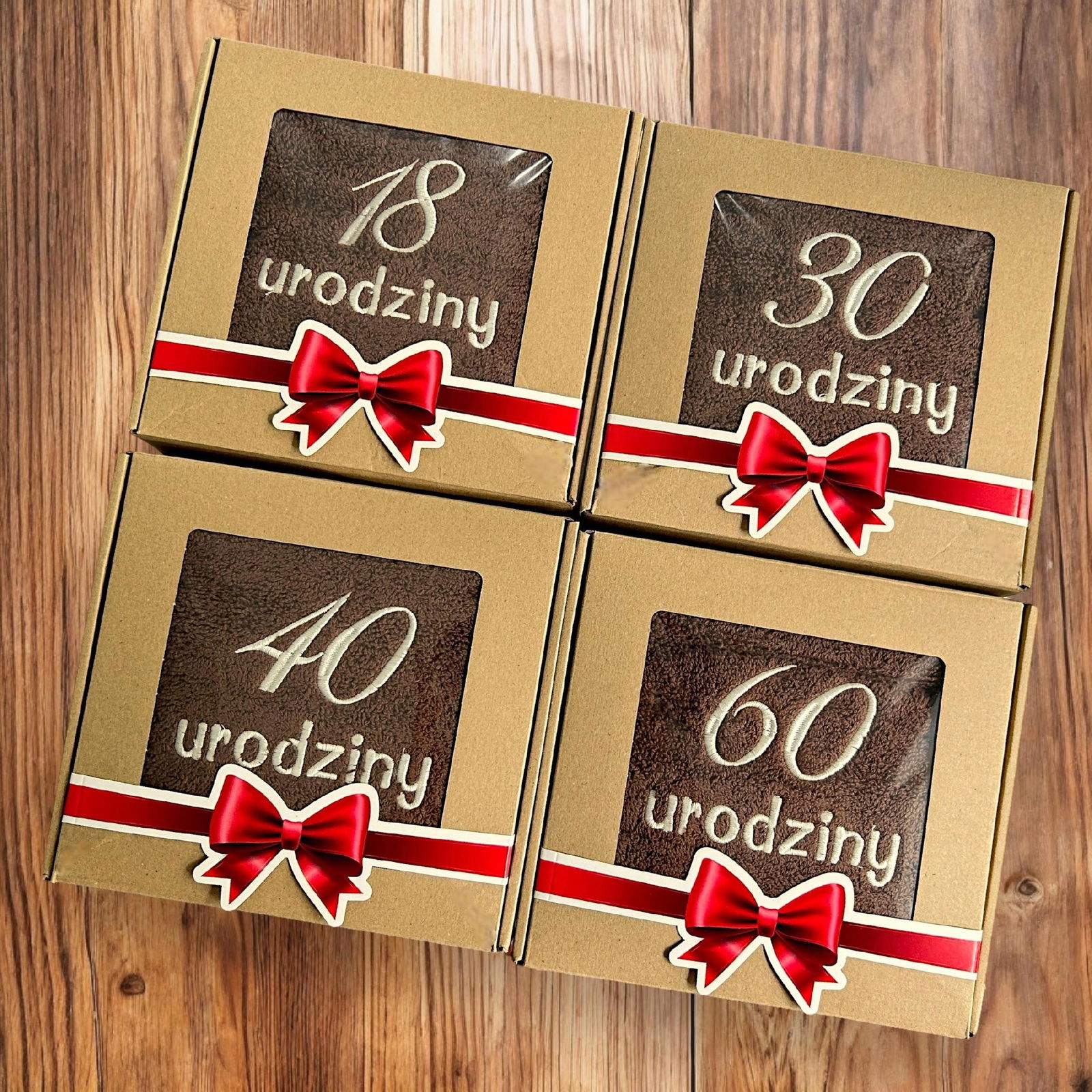 ręcznik o wymiarach 50x100cm z wyhaftowanym napisem "dana cyfra i napis urodziny"