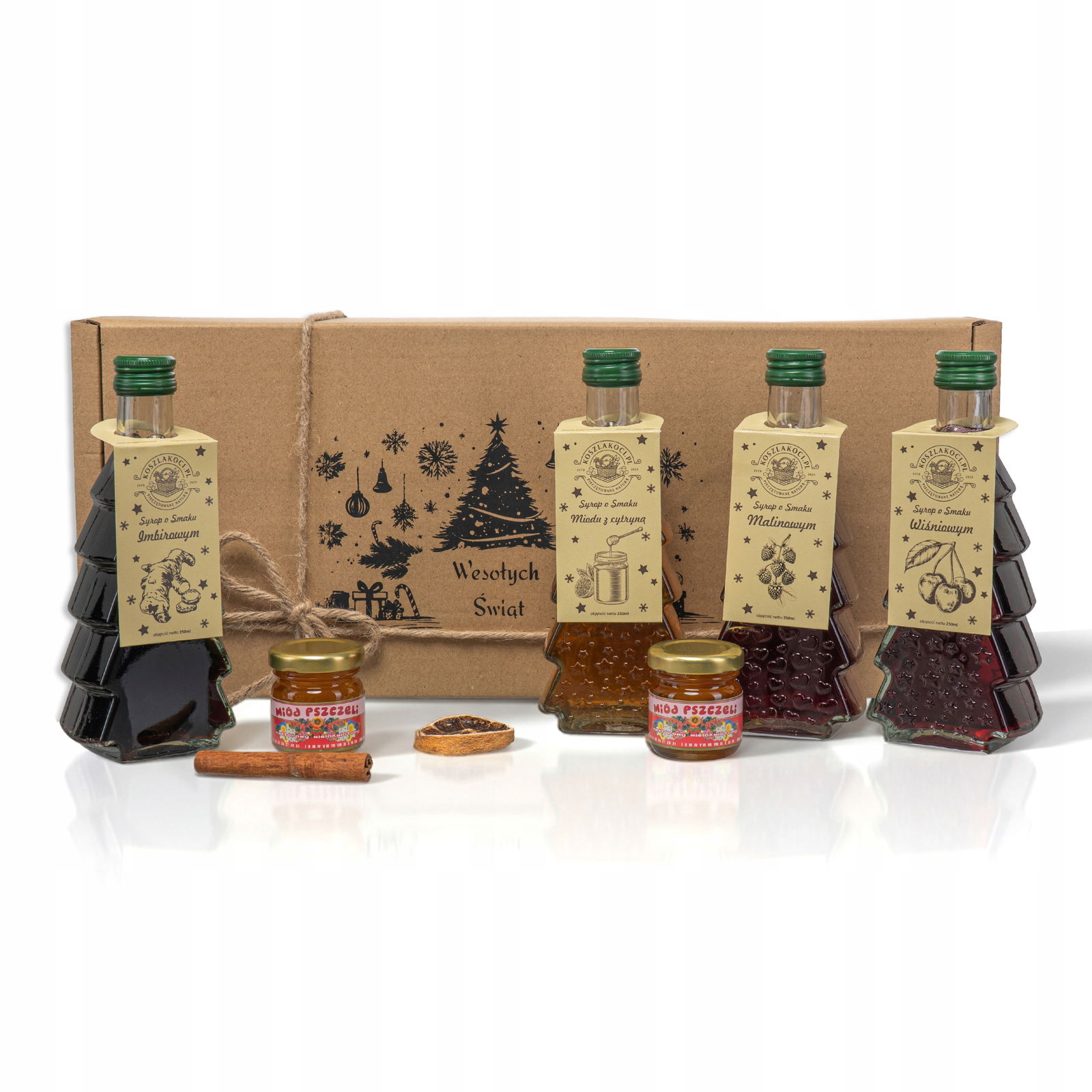 Zestaw Świąteczny 4 Syropy + Miody + Dodatki – BUTELKA Z TŁOCZENIEM WESOŁYCH ŚWIĄT! � 5 zestawów