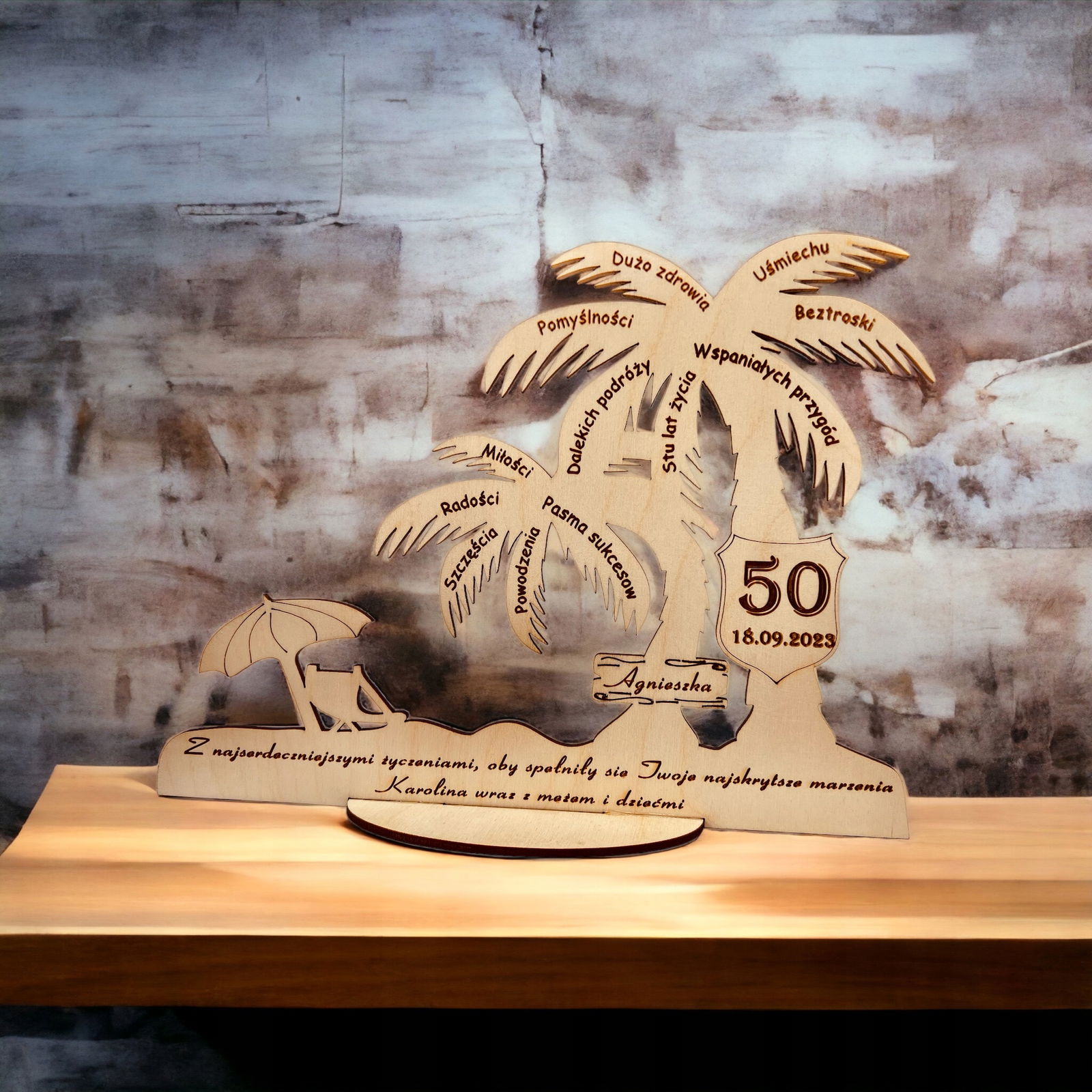 ☀️Postaw na innowacyjny prezent z motywem palmy, który idealnie nadaje się na okazję urodzinową dla bliskiej osoby. Możesz dowolnie spersonalizować dekorację dzięki naszej autorskiej pracowni grawerskiej GRAWERNIADDZ.