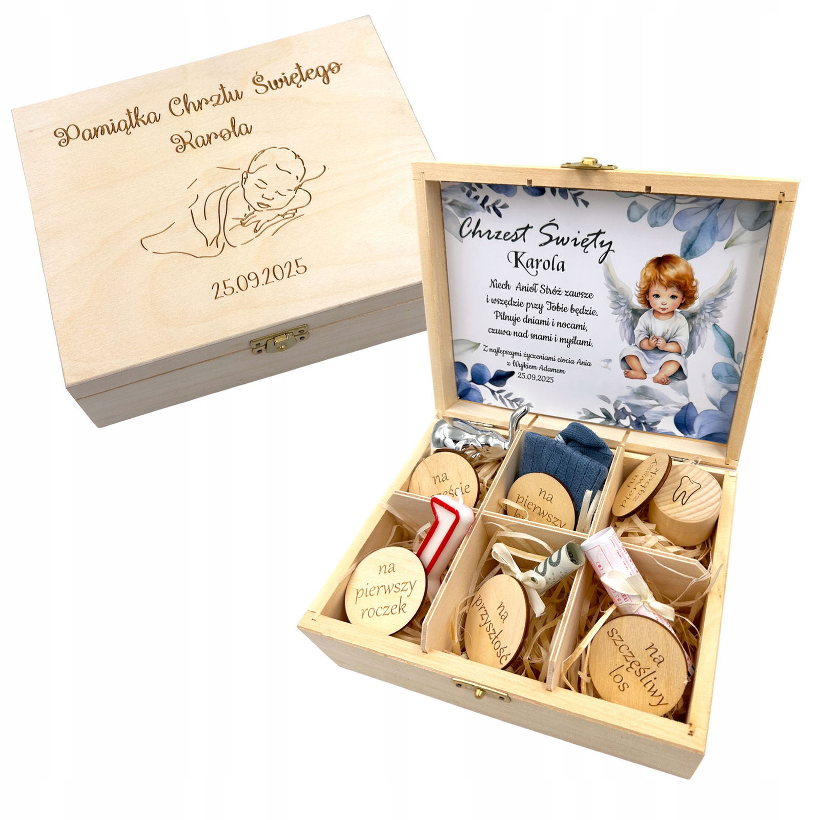 Śliczny niezbędnik to idealny prezent dla dziecka na Chrzest Święty, wyjątkowa pamiątka na długie lata. W pudełeczku z jasnego drewna można umieścić dziecięce skarpetki, los na loterię, słonika na szczęście, świeczkę, gotówkę oraz pudełeczko na pierwszy ząbek.