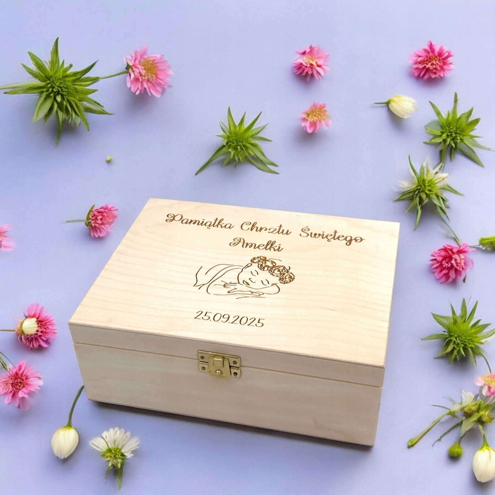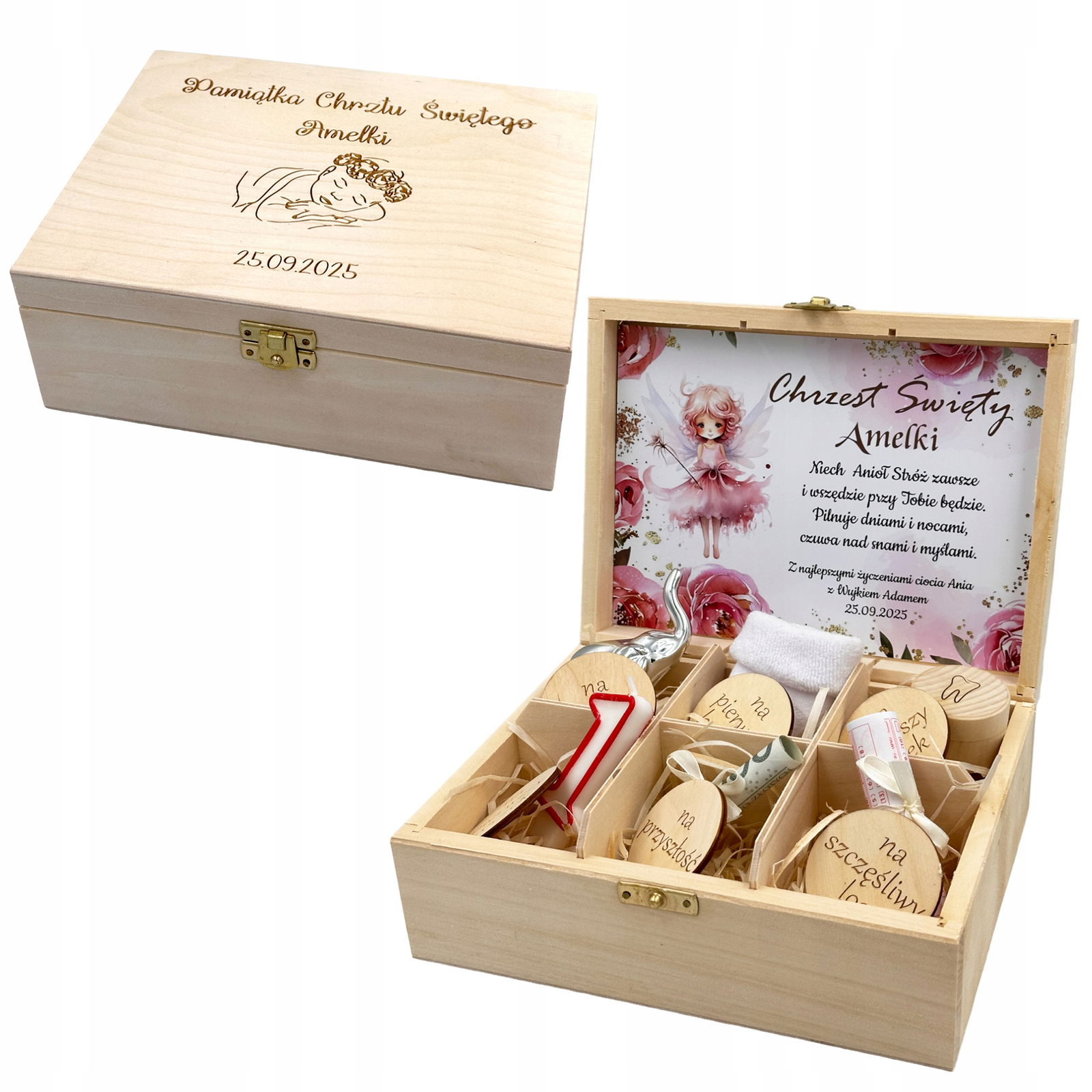 Śliczny niezbędnik to idealny prezent dla dziecka na Chrzest Święty, wyjątkowa pamiątka na długie lata. W pudełeczku z jasnego drewna można umieścić dziecięce skarpetki, los na loterię, słonika na szczęście, świeczkę, gotówkę oraz pudełeczko na pierwszy ząbek.