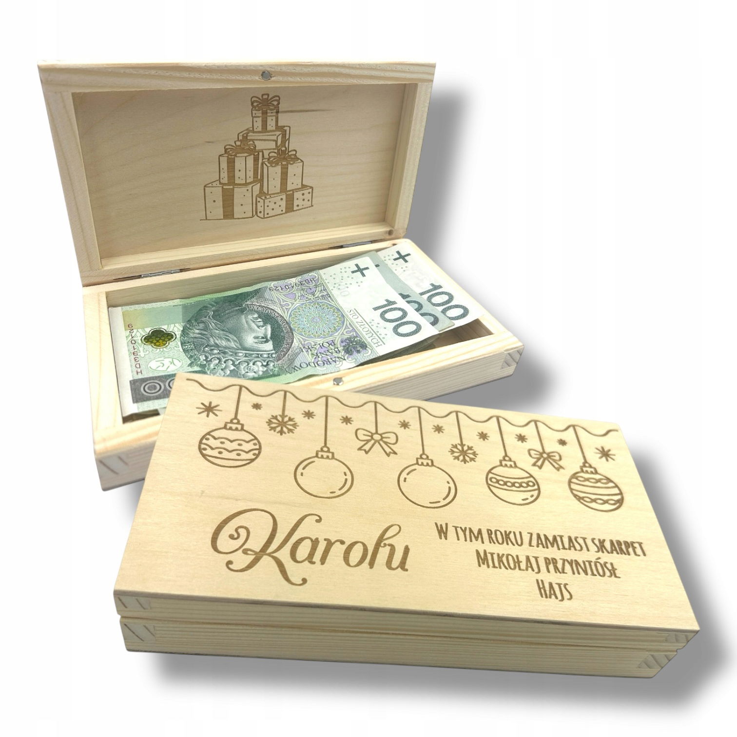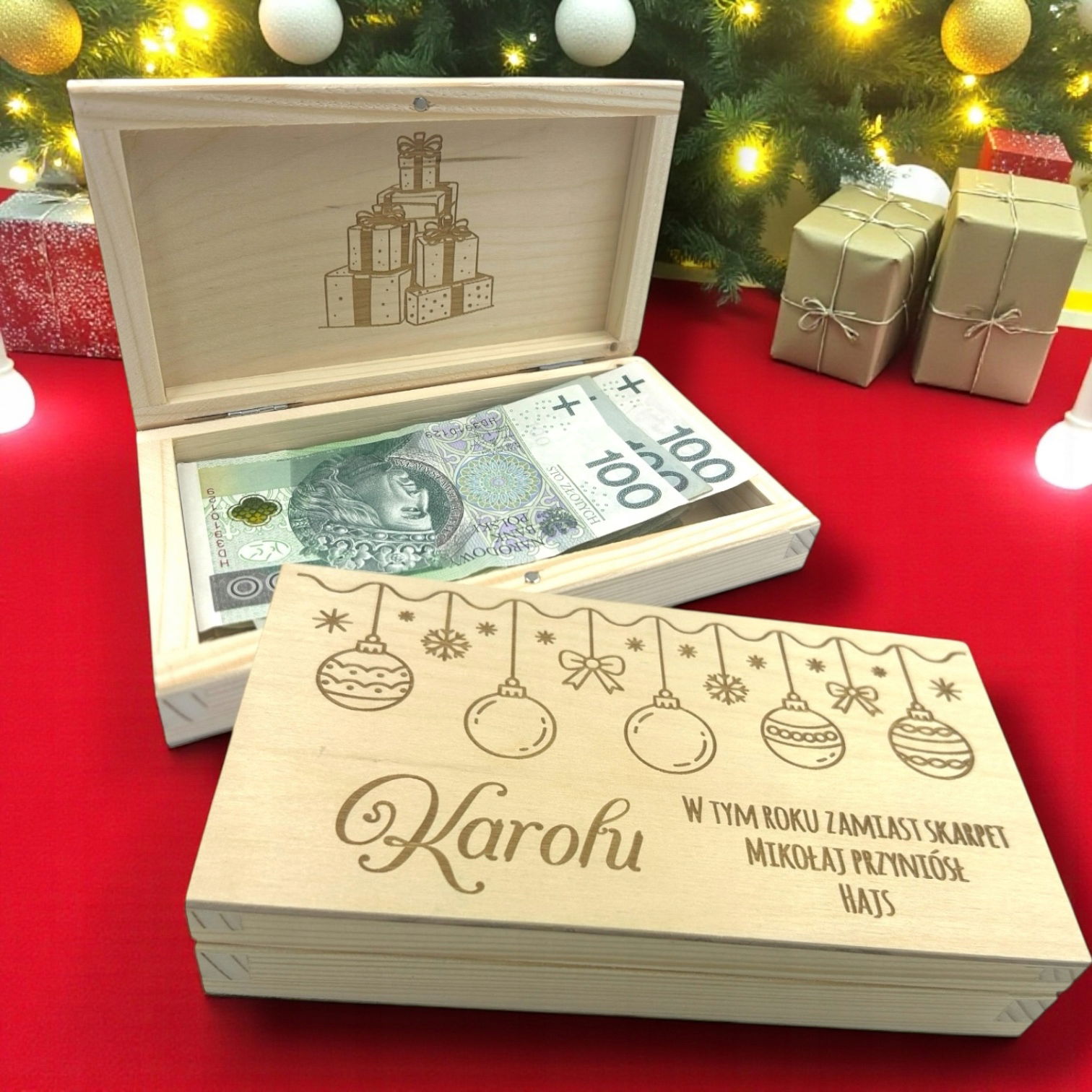 Ta elegancka drewniana skrzynka z grawerem to idealny sposób, by wręczyć pieniądze w wyjątkowy, zabawny i świąteczny sposób!
