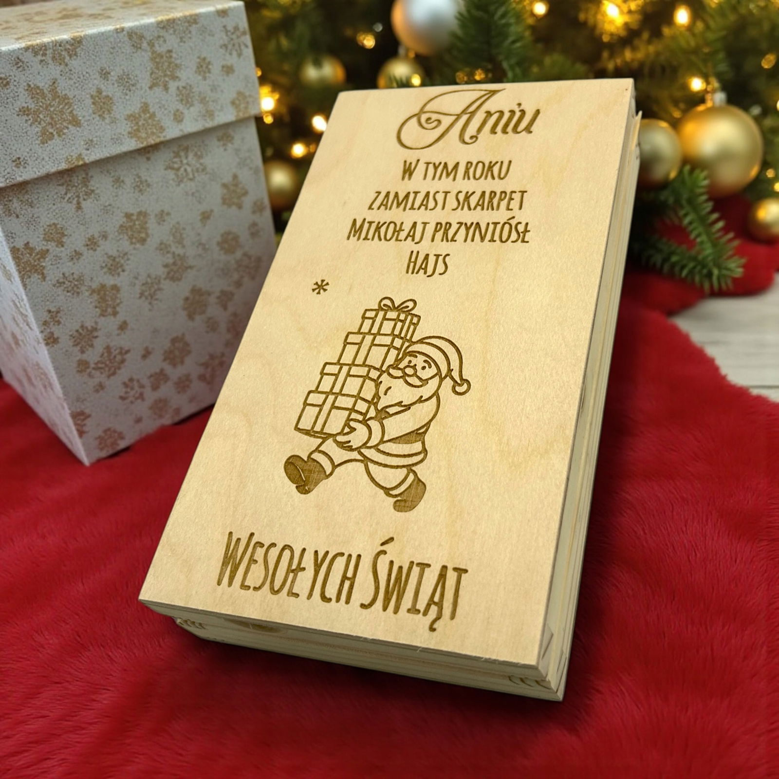 Ta elegancka drewniana skrzynka z grawerem to idealny sposób, by wręczyć pieniądze w wyjątkowy, zabawny i świąteczny sposób!