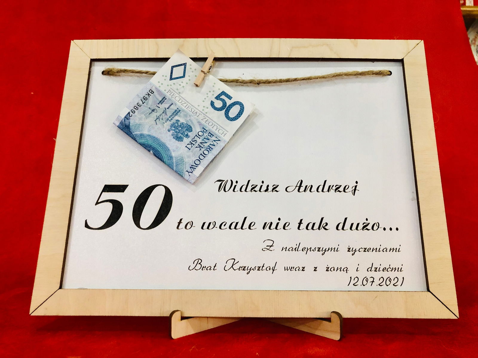 1) Andrzej, 50 2) Z okazji urodzin wszystkiego najlepszego życzy Anita, Iwona i Paweł, 15.02.2023 3) Kolor obramowania ramki CZARNY