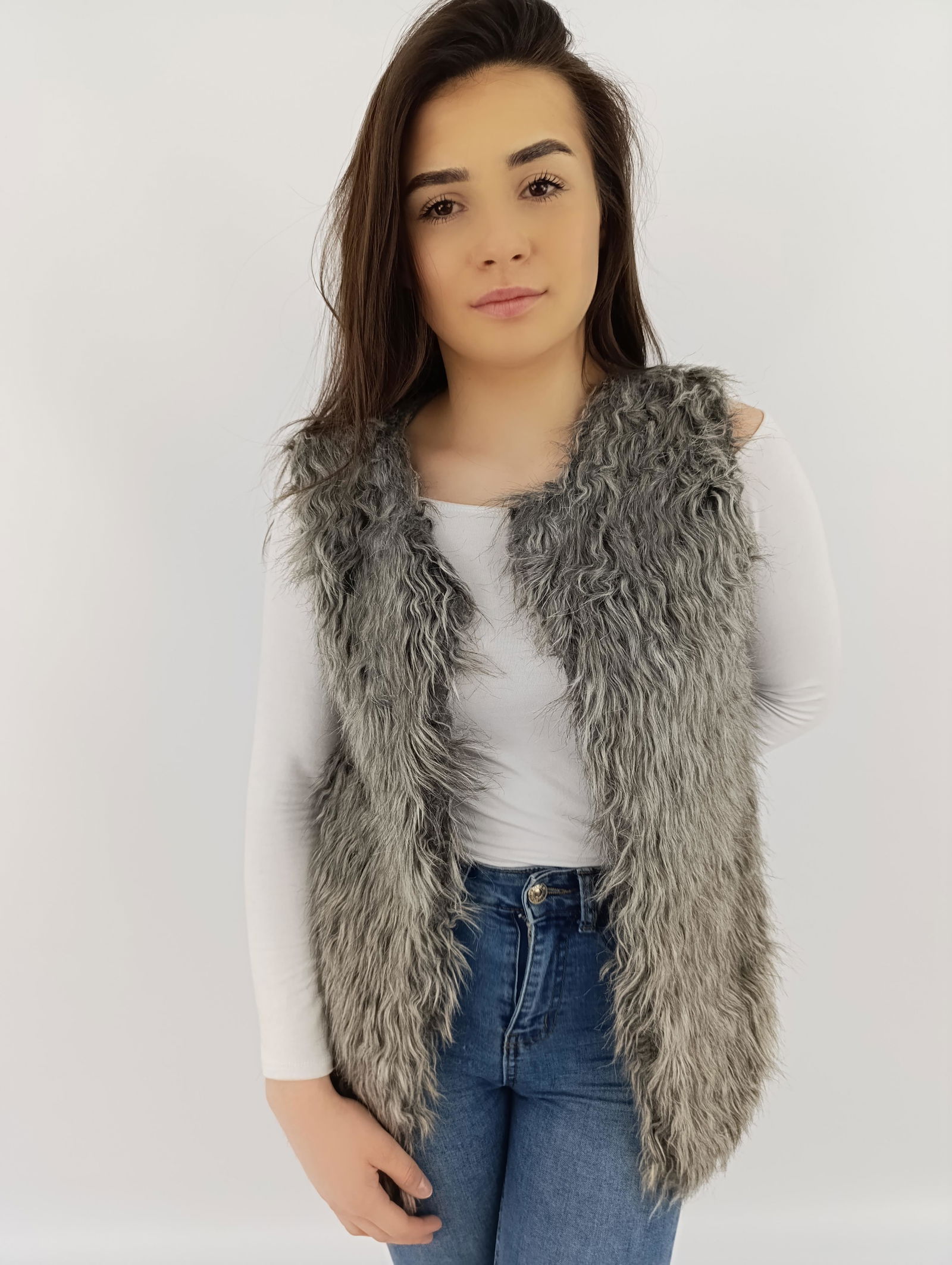 Kamizelka damska marki PRIMARK wykonana z akrylu, z futrzanym przodem i tyłem w formie sweterka, idealna na chłodniejsze dni.