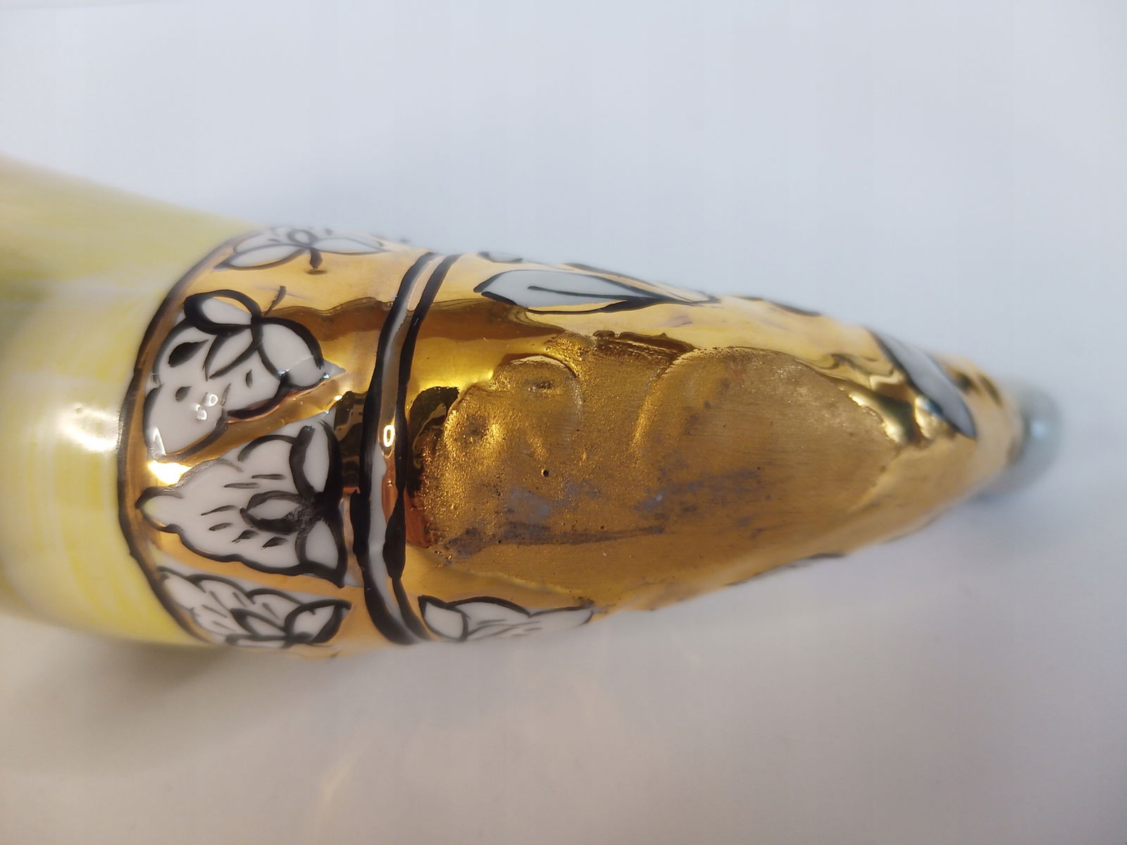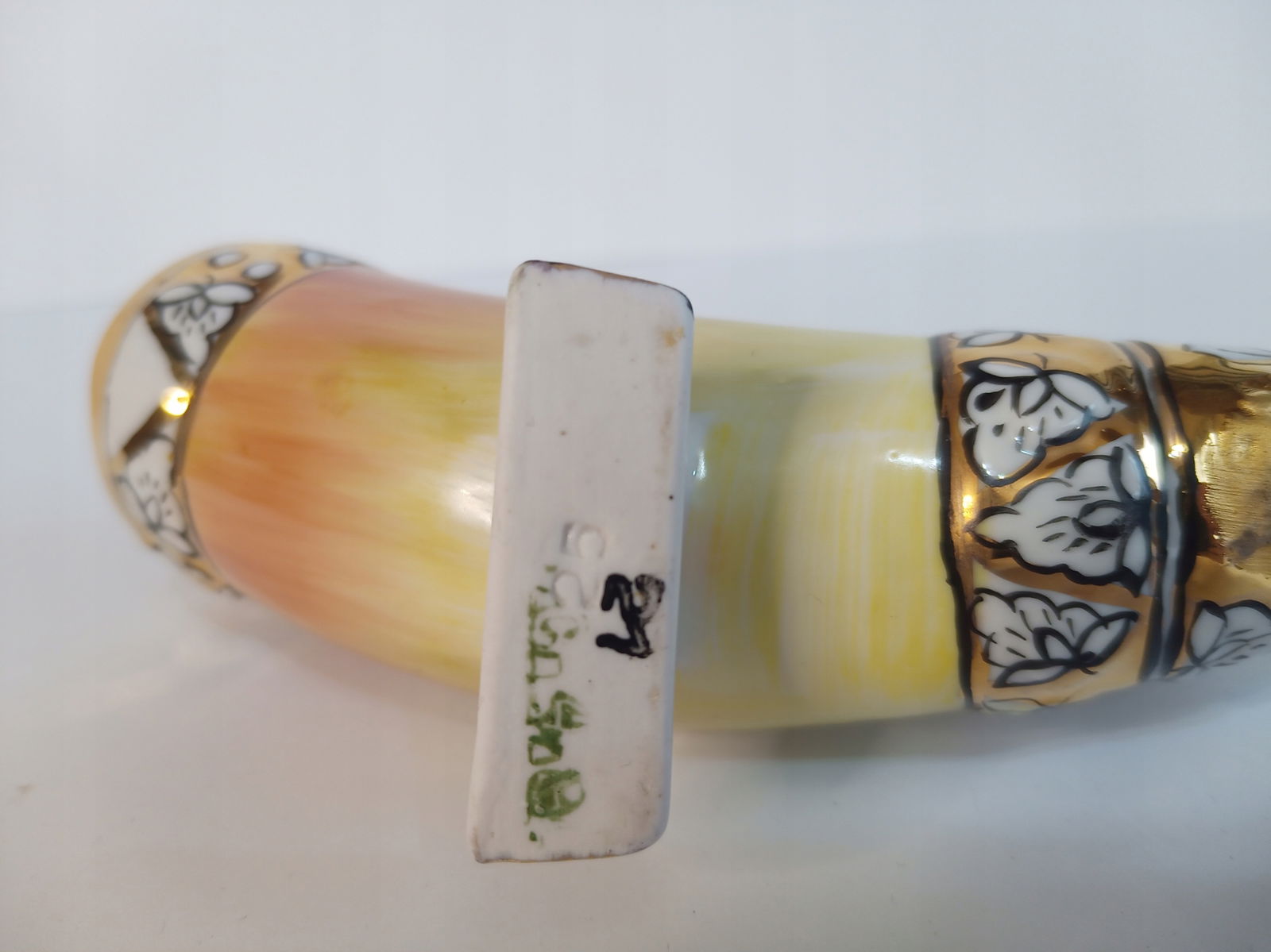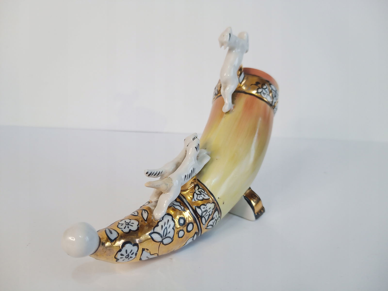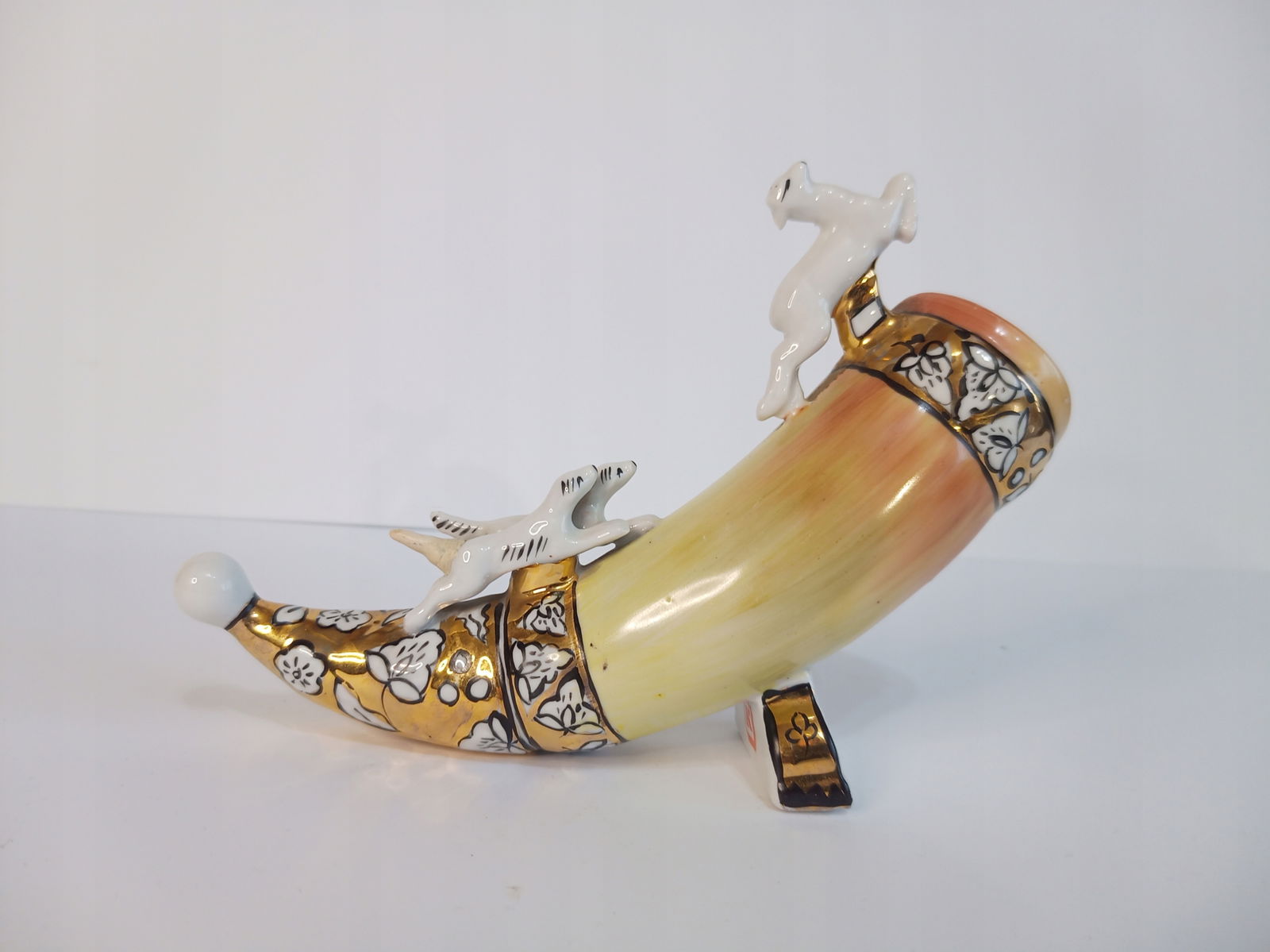Firma New Rockers oferuje Państwu pamiątkę z czasów PRL - przedstawiony na zdjęciach róg porcelanowy. Proszę zwrócić uwagę na zdjęcia. Jeden ogon był urwany i ktoś go dorobił. Na dole, gdzie farba była wytarta, ktoś pomalował róg złota farbą.