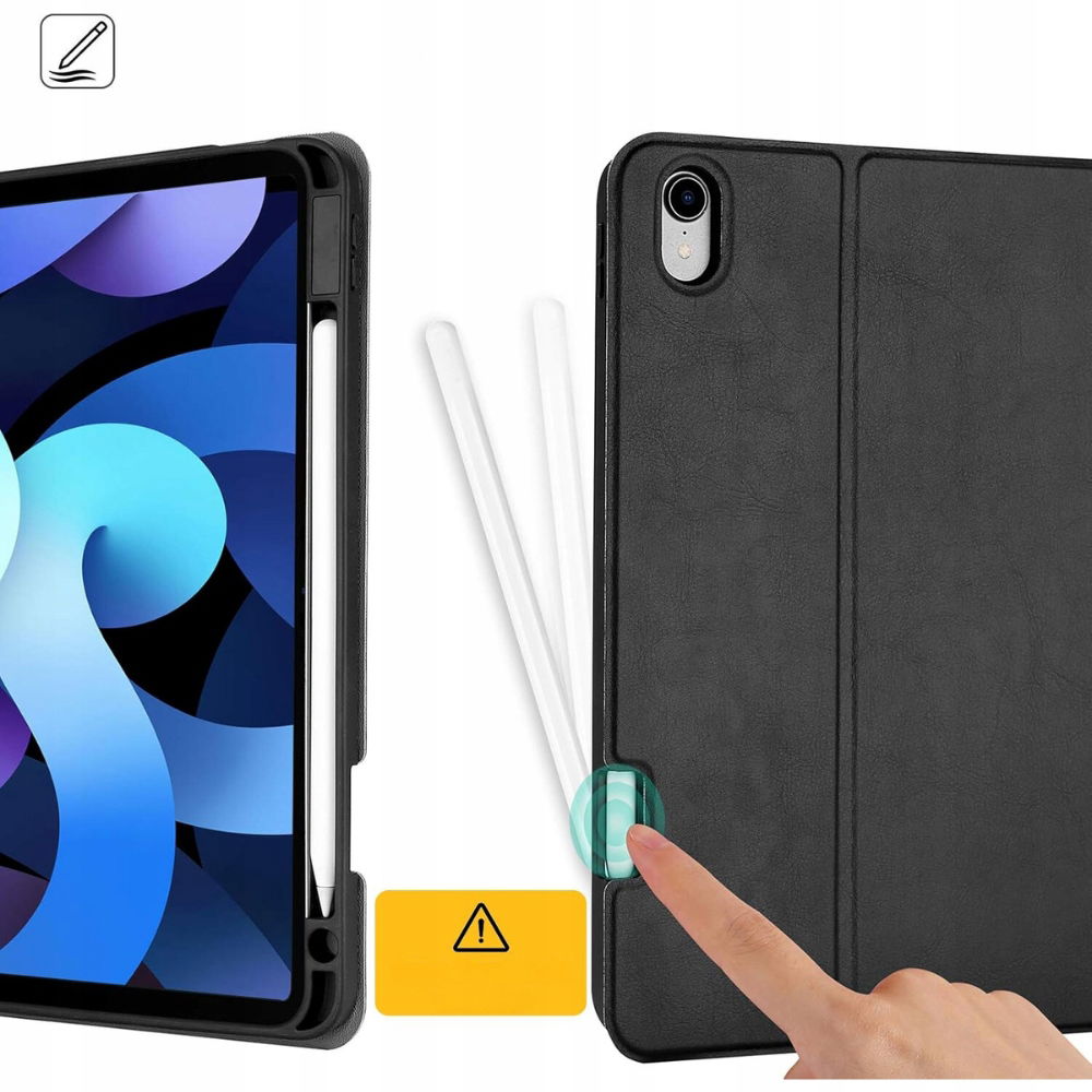 Etui zewnętrzne zostało wykonane z wysokiej jakości sztucznej skóry, co zapewnia solidną ochronę przed uszkodzeniami mechanicznymi, takimi jak upadki czy uderzenia. Miękkie, antypoślizgowe wnętrze zabezpiecza ekran iPada przed zarysowaniami. Dodatkowo etui posiada wbudowany uchwyt na długopis, co zapewnia wygodę korzystania z Apple Pencil i jego bezpieczne przechowywanie.