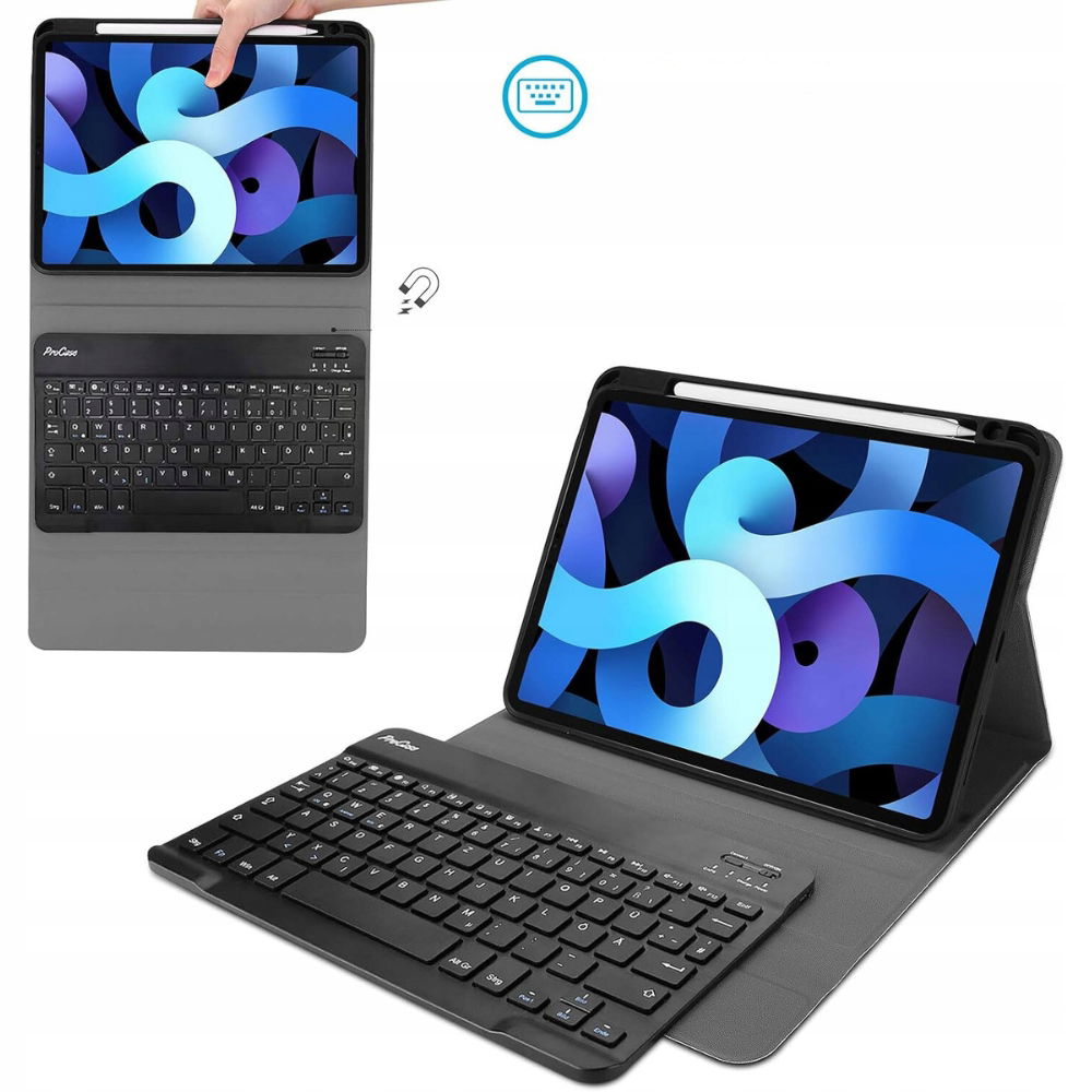 Etui ProCase z niemiecką klawiaturą QWERTZ zostało zaprojektowane z myślą o użytkownikach iPada Air 4 generacji 10,9 cala (2020) oraz kompatybilne z modelem iPad Air 5 generacji 2022. To eleganckie, ultracienkie etui posiada wbudowany uchwyt na długopis oraz wyjmowaną klawiaturę bezprzewodową. Zestaw zapewnia funkcjonalność oraz bezpieczeństwo podczas użytkowania iPada, dzięki solidnej ochronie i wsparciu dla funkcji automatycznego uśpienia/wybudzenia.