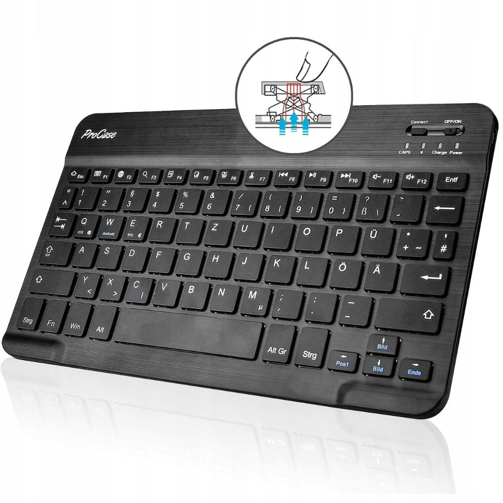 Innowacyjna, bezprzewodowa klawiatura w etui ProCase zapewnia wygodę użytkowania dzięki możliwości jej łatwego demontażu. Mocowanie magnetyczne umożliwia szybkie odłączenie klawiatury w dowolnym momencie, co sprawia, że etui może służyć zarówno jako klasyczna ochrona, jak i jako zaawansowane narzędzie do pracy. Klawiatura jest kompatybilna z niemieckim układem QWERTZ, idealnym dla osób pracujących z tym językiem.